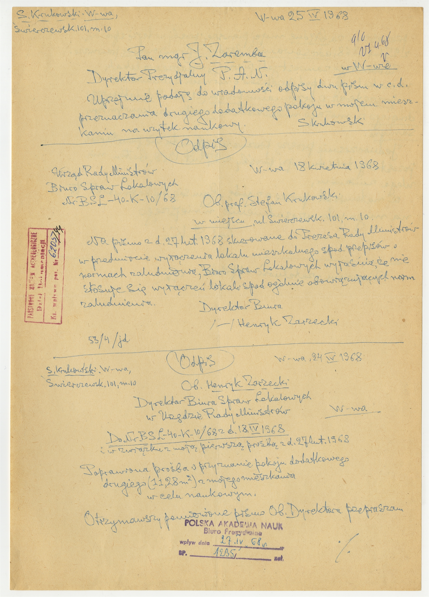 Rękopis - brudnopis listu S. Krukowskiego do J. Zaręby Dyrektora Prezydialnego PAN z dn. 25 IV 1968 r.