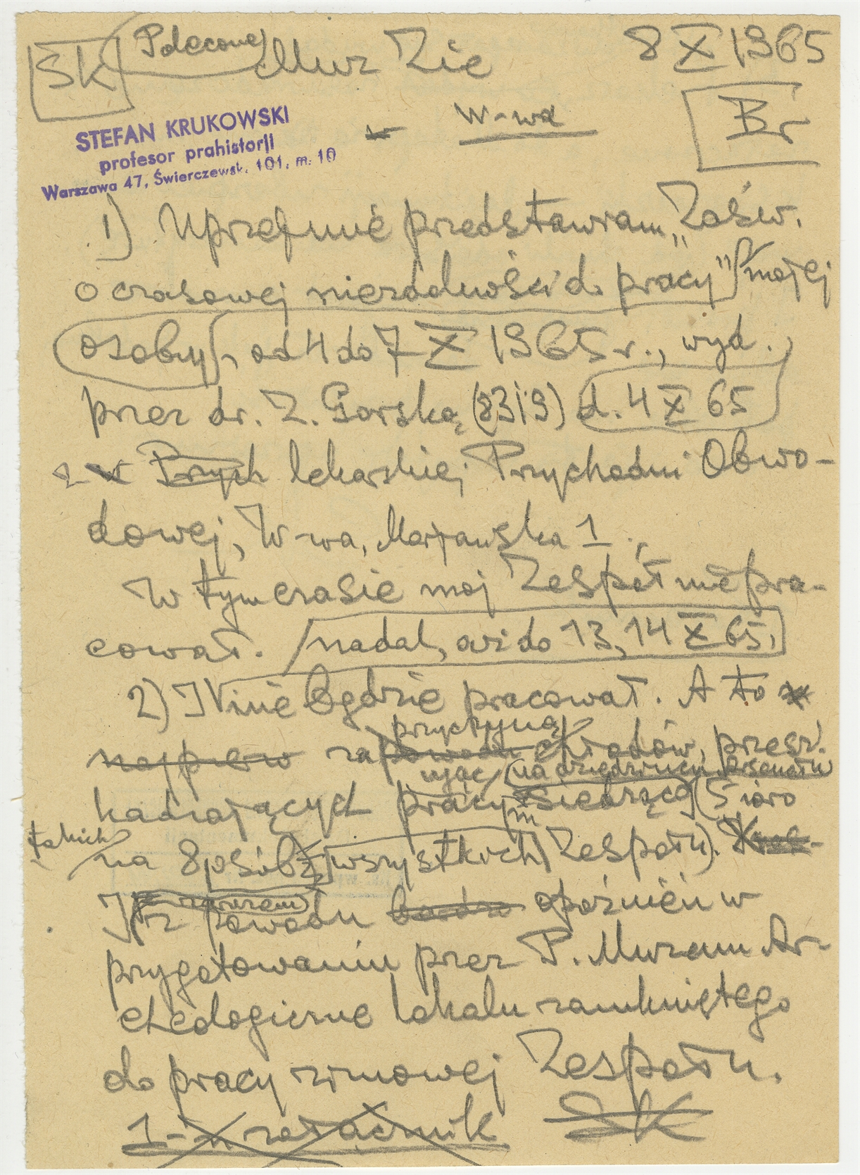 Rękopis - brudnopis listu S. Krukowskiego do Muzeum Ziemi PAN z dn. 8 X 1965 r.