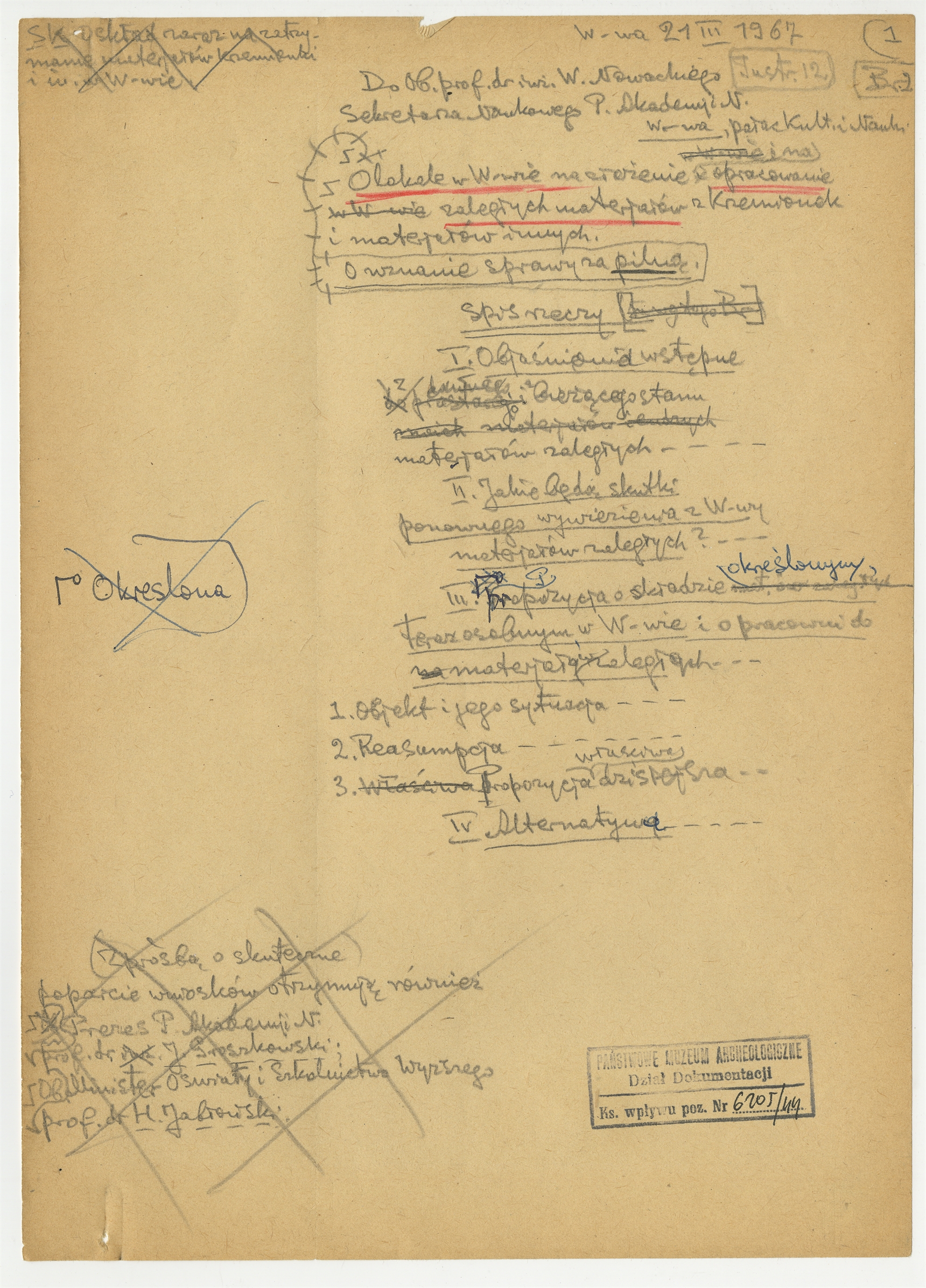 Rękopis - brudnopis listu S. Krukowskiego do W. Nowackiego Sekretarza Naukowego PAN z dn. 21 III 1967 r. Strona 1