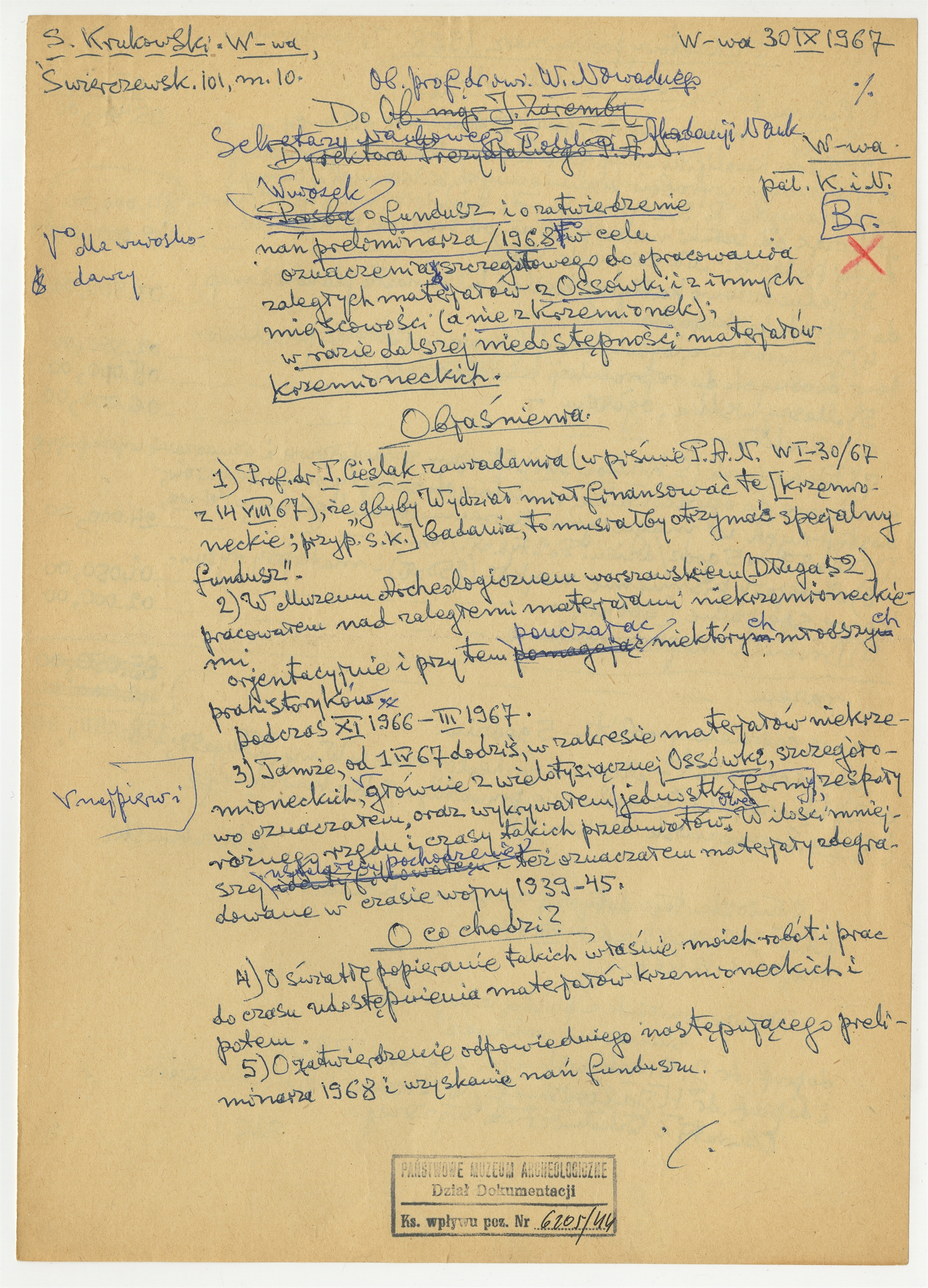 Rękopis - brudnopis listu S. Krukowskiego do W. Nowackiego Sekretarza Naukowego PAN z dn. 30 IX 1967 r.