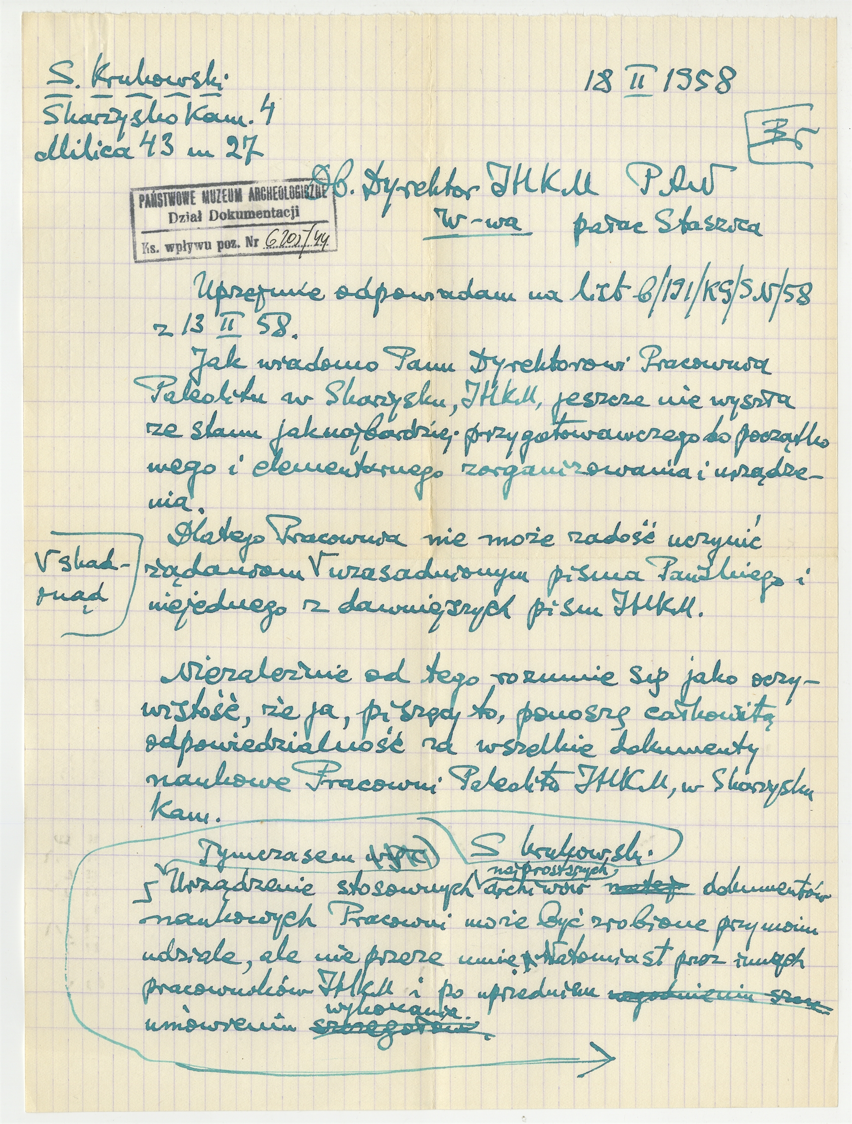Rękopis - brudnopis listu S. Krukowskiego z dnia 18 II 1958 roku do Dyrektora IHKM PAN - druga wersja (zielonym atramentem)