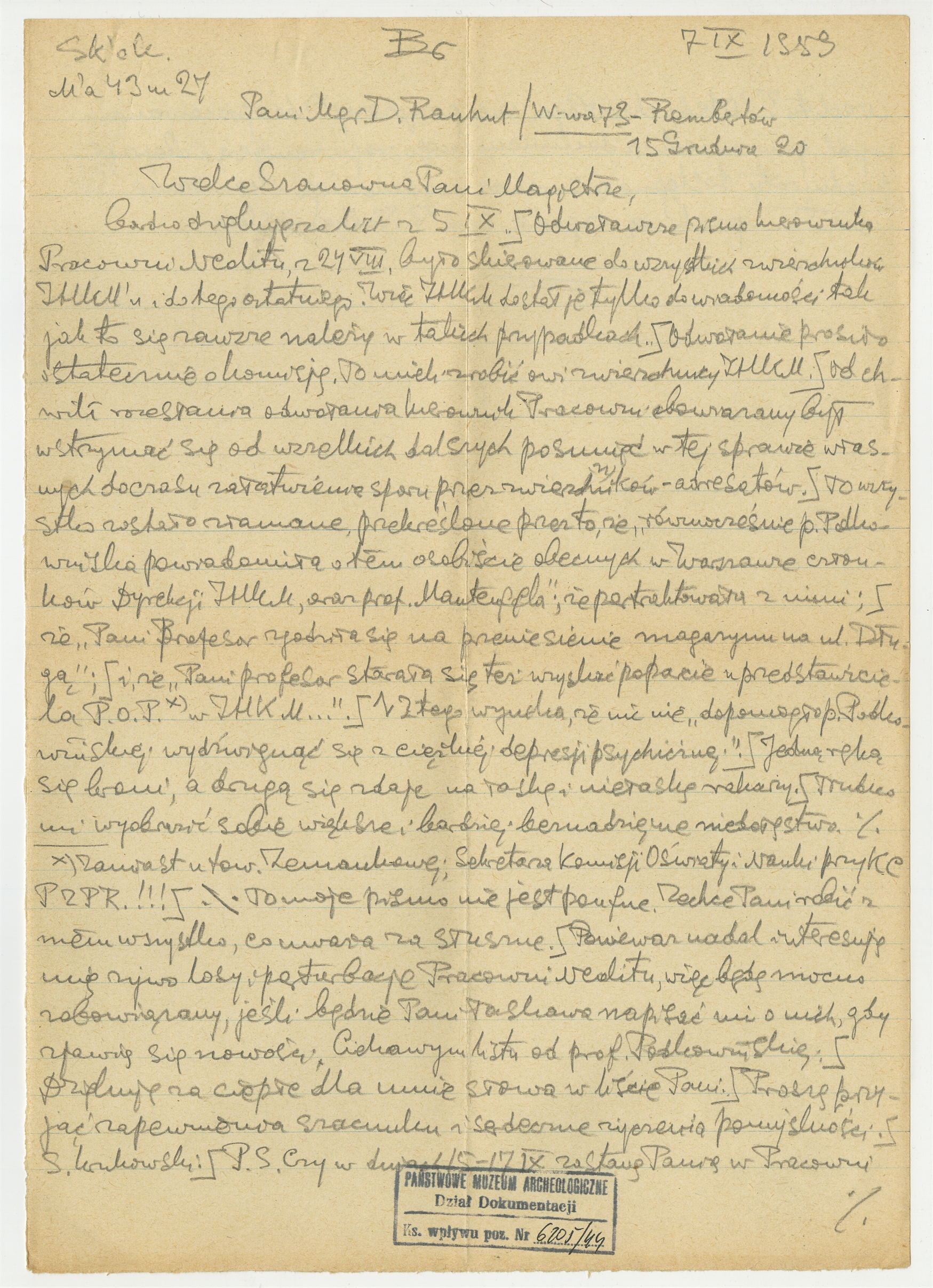 Rękopis - brudnopis listu S. Krukowskiego z dnia 7 IX 1959 roku do D. Rauhut