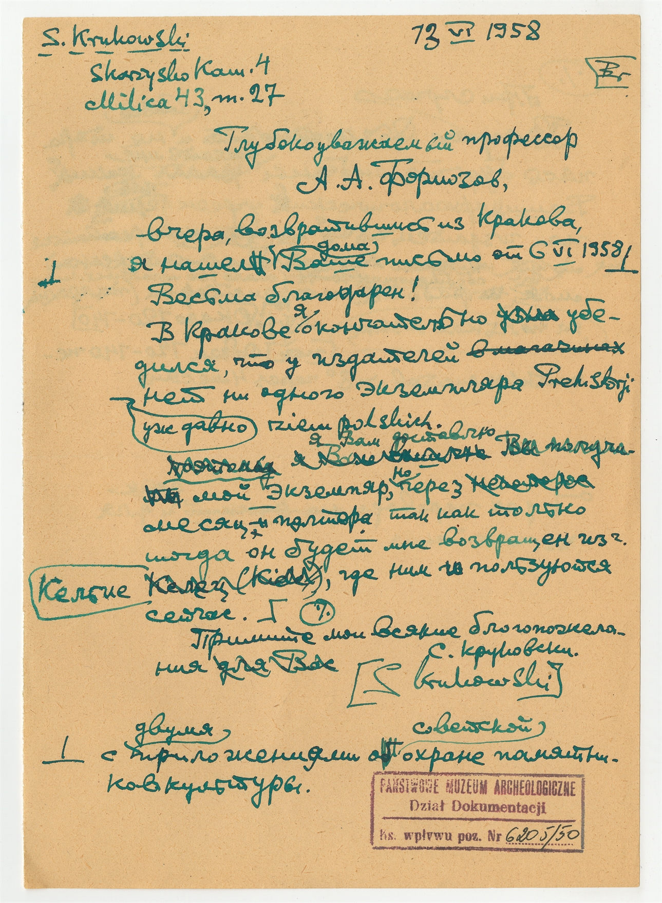 Rękopis - brudnopis listu Stefana Krukowskiego do Aleksandra A. Formozowa z dn. 13 VI 1958 r.