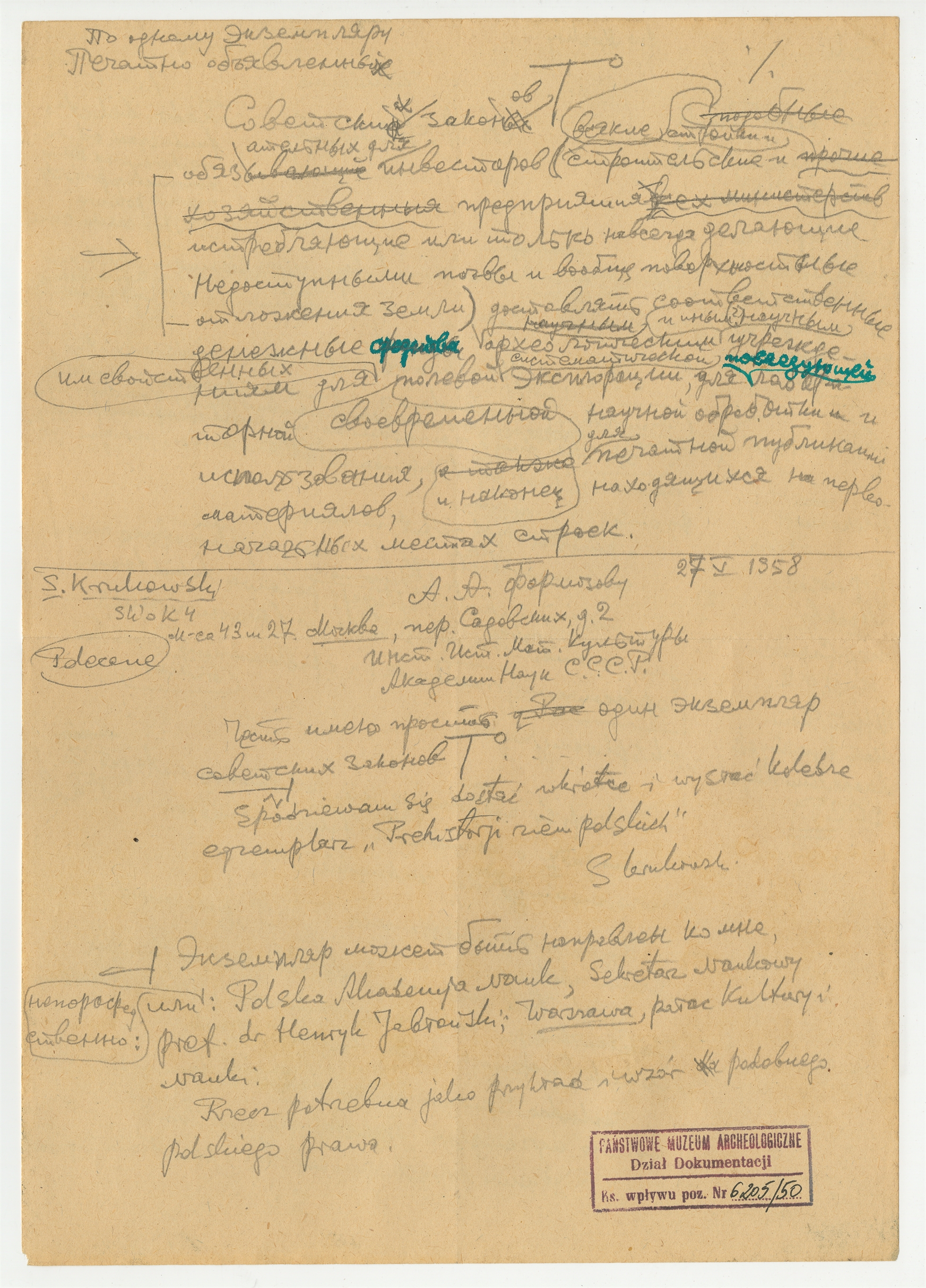 Rękopis - brudnopis listu Stefana Krukowskiego do Aleksandra A. Formozowa z dn. 25 V 1958 r. (cd); Rękopis - brudnopis listu Stefana Krukowskiego do Aleksandra A. Formozowa z dn. 27 V 1958 r.