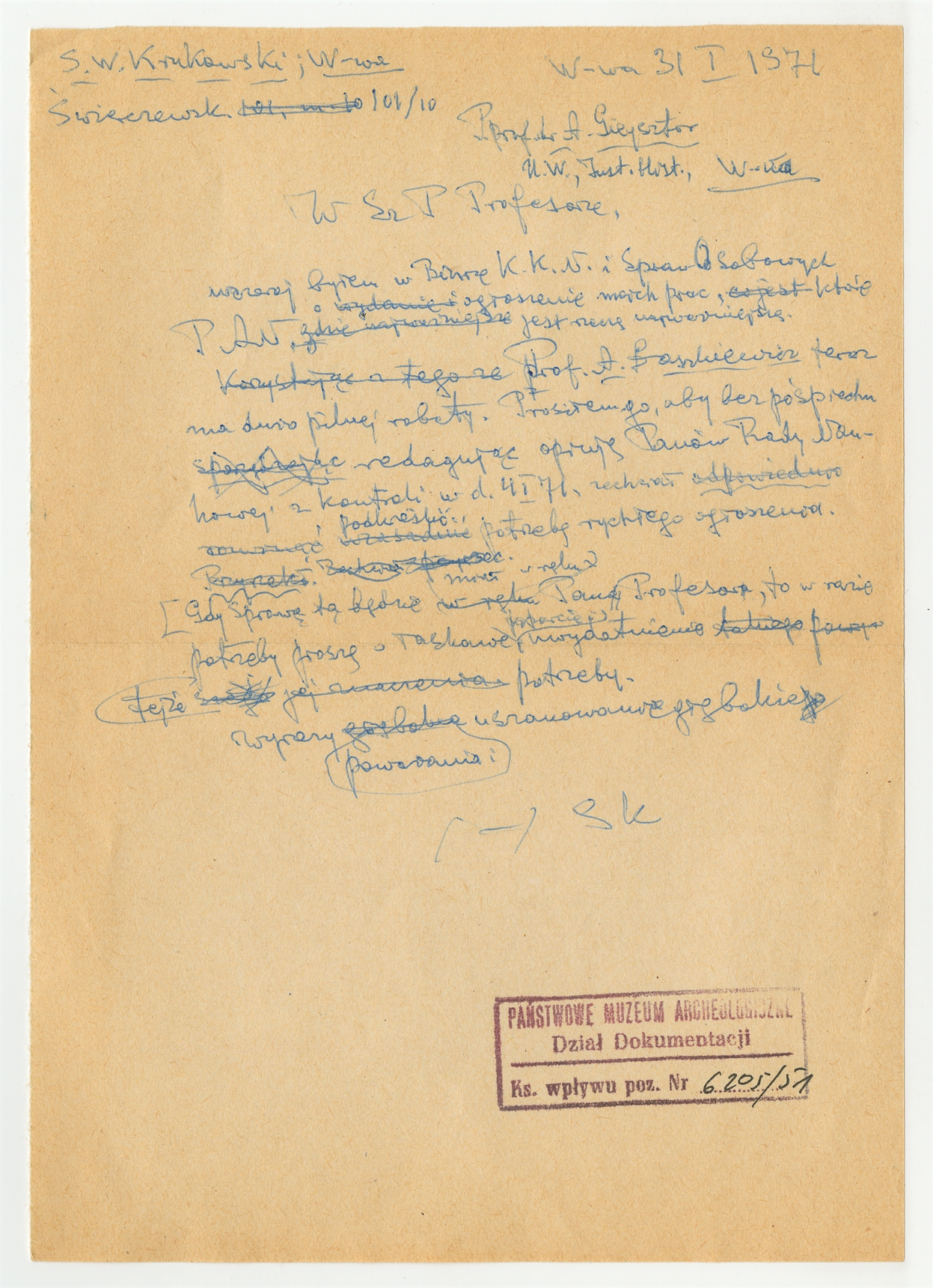 Rękopis - brudnopis listu Stefana Krukowskiego do Aleksandra Gieysztora z dnia 31 I 1971 roku