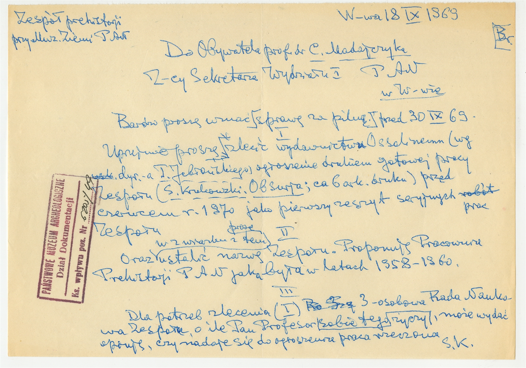 Rękopis - brudnopis listu Stefana Krukowskiego do C. Madajczyka z dn. 18 IX 1969 r.