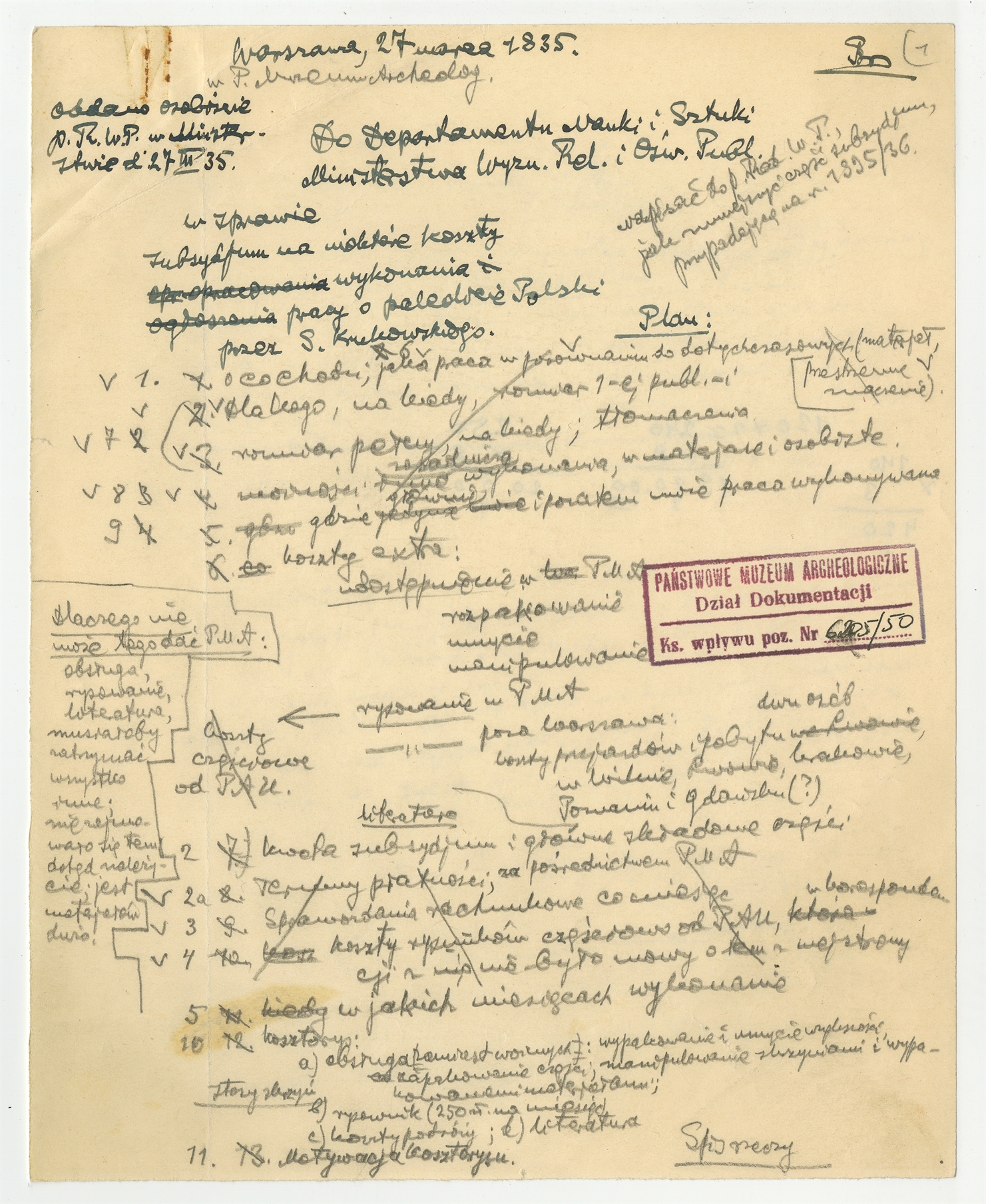 Rękopis - brudnopis listu Stefana Krukowskiego do Departamentu Nauki i Sztuki Ministerstwa Wyznań Religijnych i Oświecenia Publicznego z dn. 27 III 1935 r.