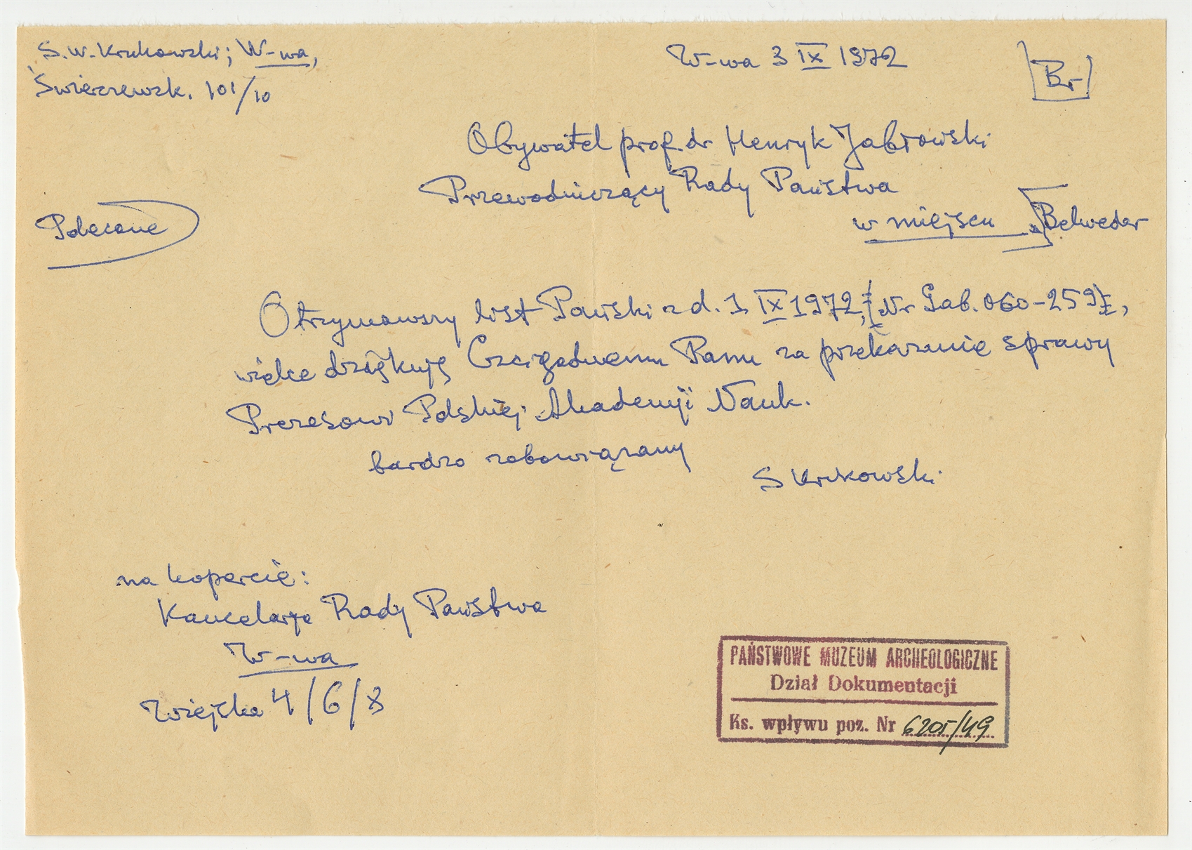 Rękopis - brudnopis listu Stefana Krukowskiego do Henryka Jabłońskiego Przewodniczącego Rady Państwa z dn. 3 IX 1972 r.
