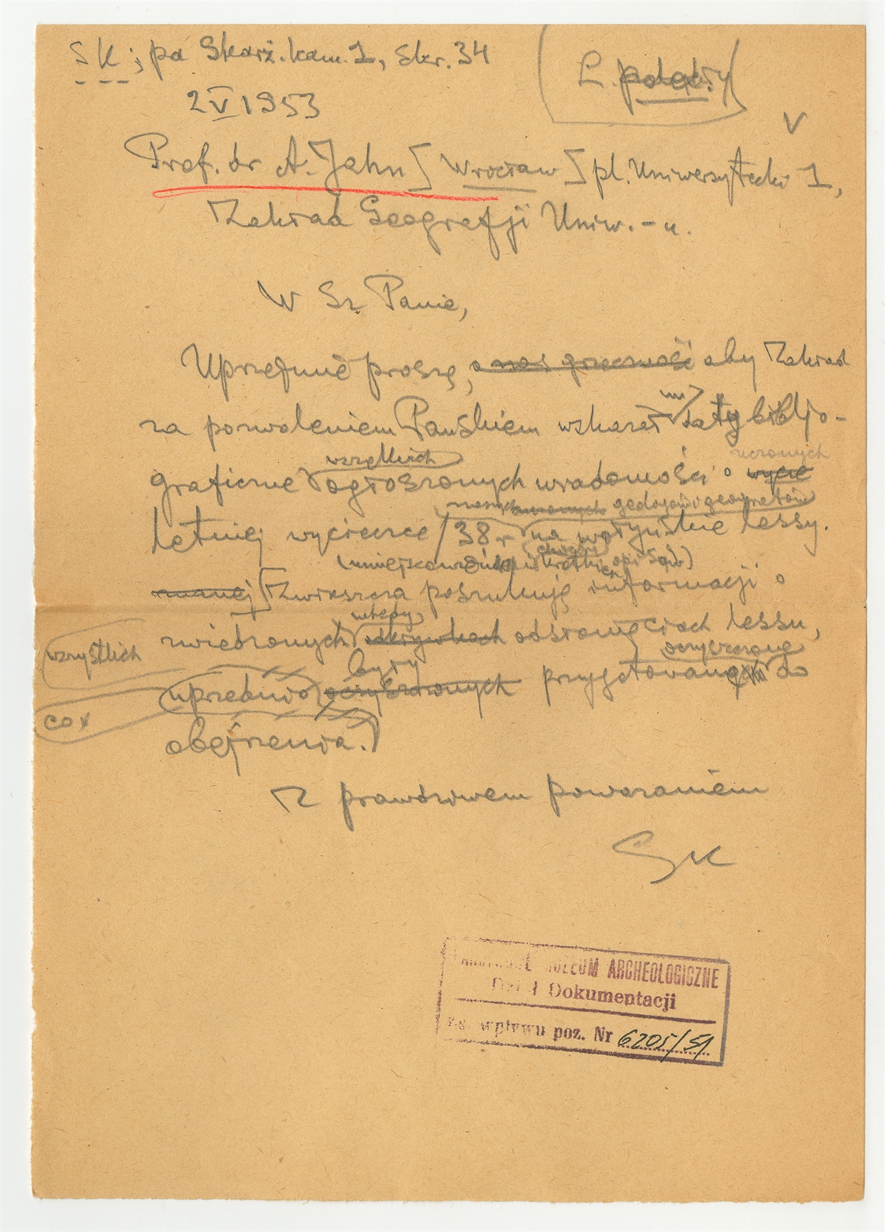 Rękopis - brudnopis listu Stefana Krukowskiego do A. Jahna z dnia 2 V 1953 roku