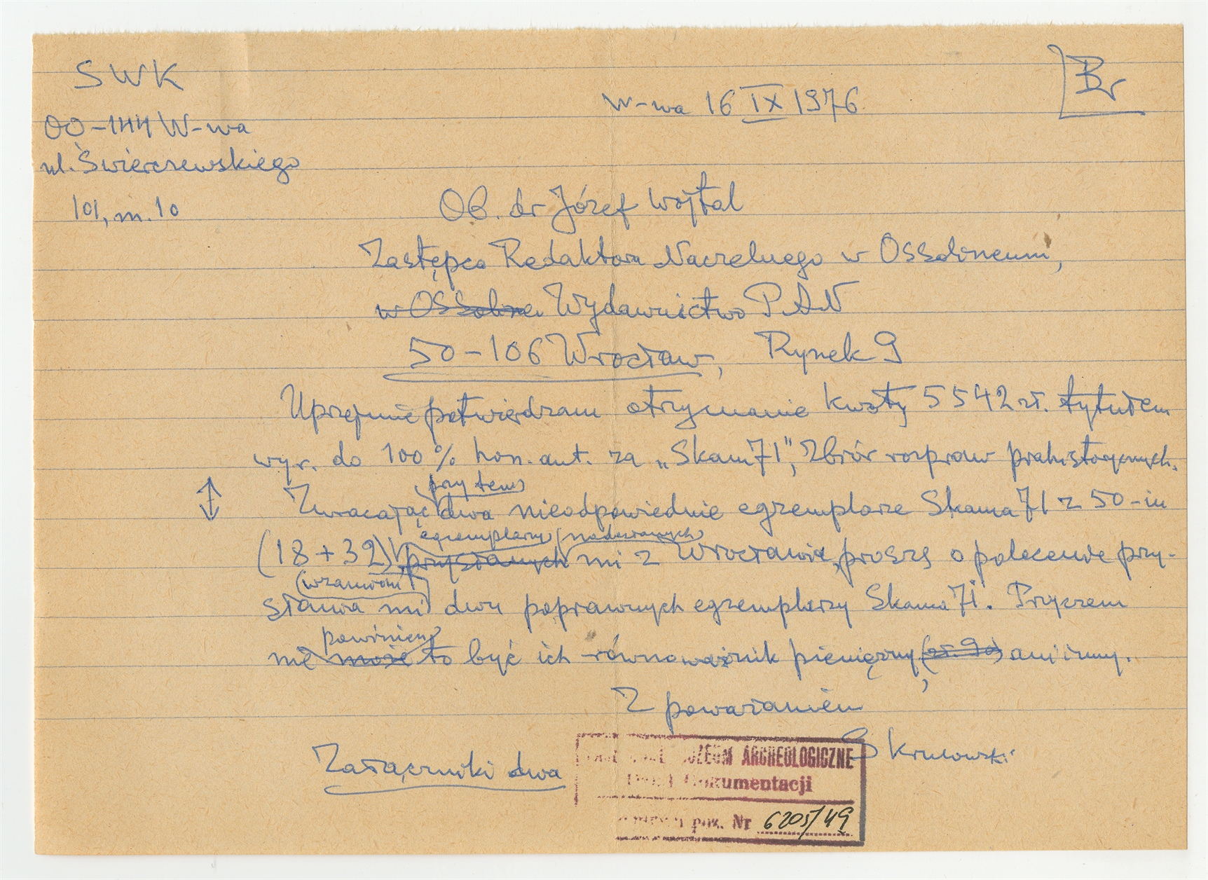 Rękopis - brudnopis listu Stefana Krukowskiego do Józefa Wojtala Zastępcy Redaktora Naczelnego Wydawnictwa Ossolineum z dn. 16 IX [19]76 r.