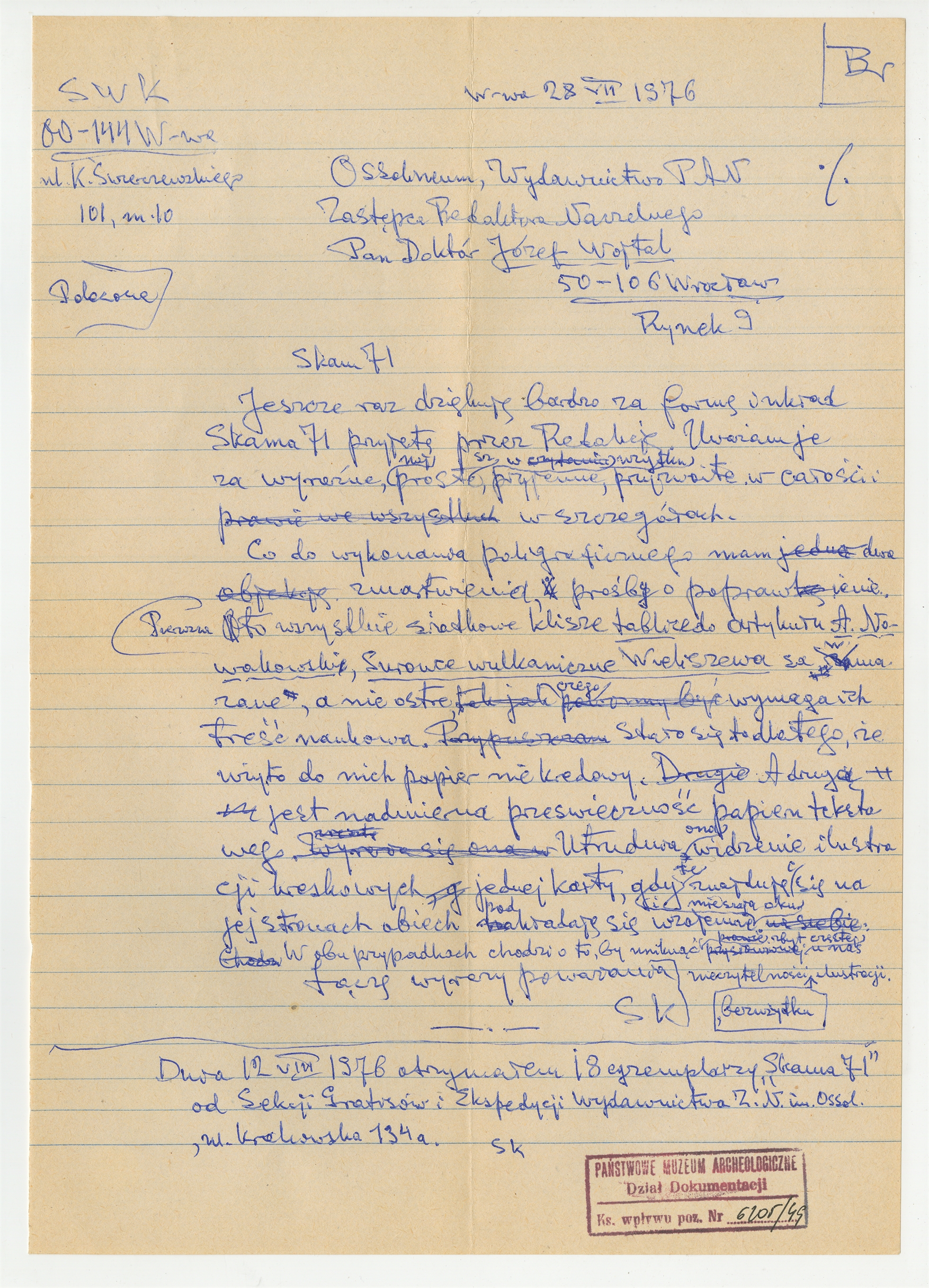 Rękopis - brudnopis listu Stefana Krukowskiego do Józefa Wojtala Zastępcy Redaktora Naczelnego Wydawnictwa Ossolineum z dn. 28 VII [19]76 r.