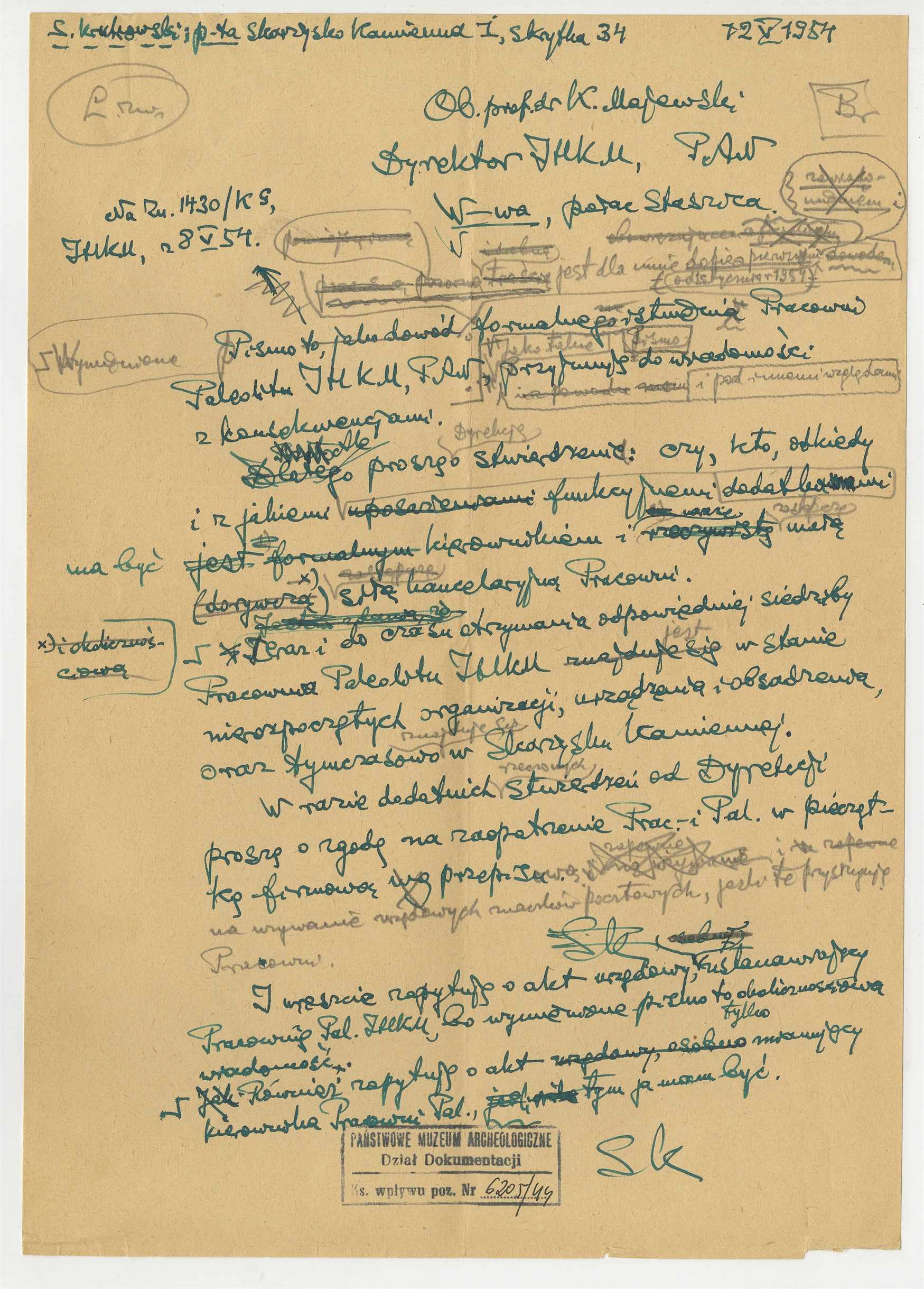 Rękopis - brudnopis listu Stefana Krukowskiego do K. Majewskiego Dyrektora IHKM PAN z dn. 12 V 1954 r.