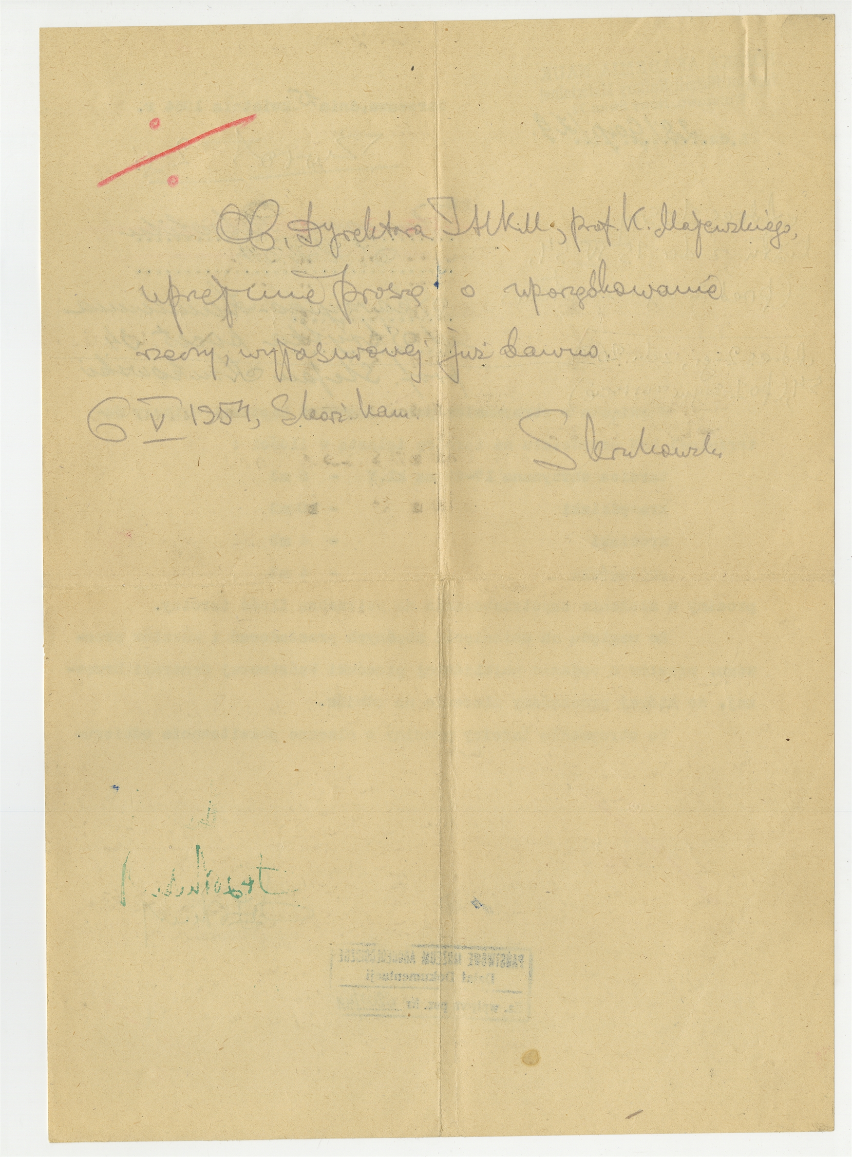 Rękopis - brudnopis listu Stefana Krukowskiego do K. Majewskiego Dyrektora IHKM PAN z dn. 6 V 1954 r.