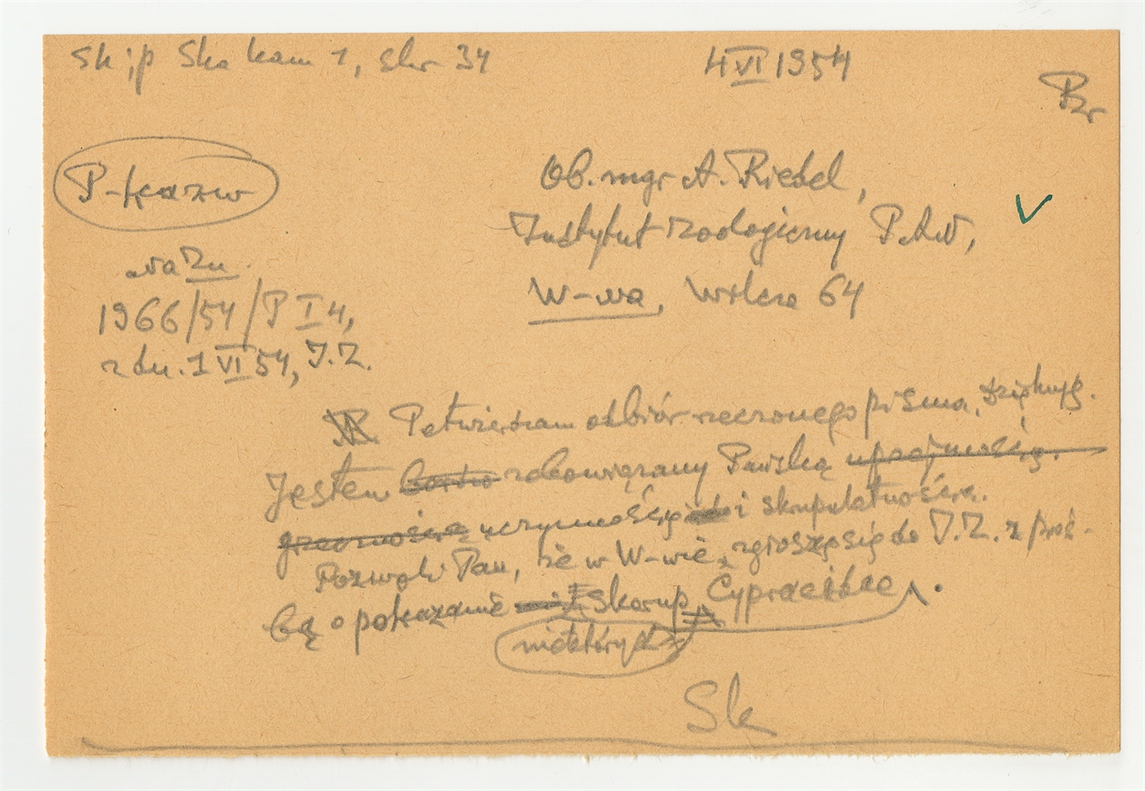 Rękopis - brudnopis listu Stefana Krukowskiego do A. Riedla z dnia 4 VI 1954 roku