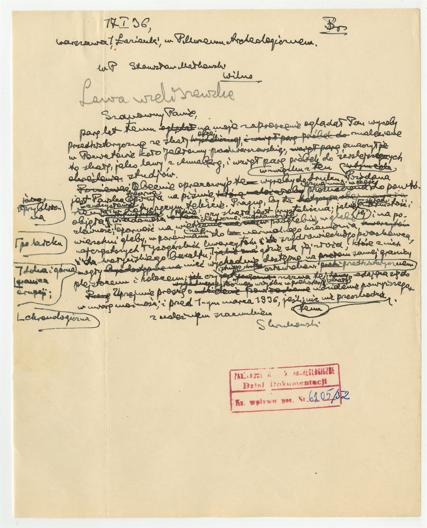 Rękopis - brudnopis listu Stefana Krukowskiego do Stanisława Małkowskiego z dnia 17 I [19]36 roku