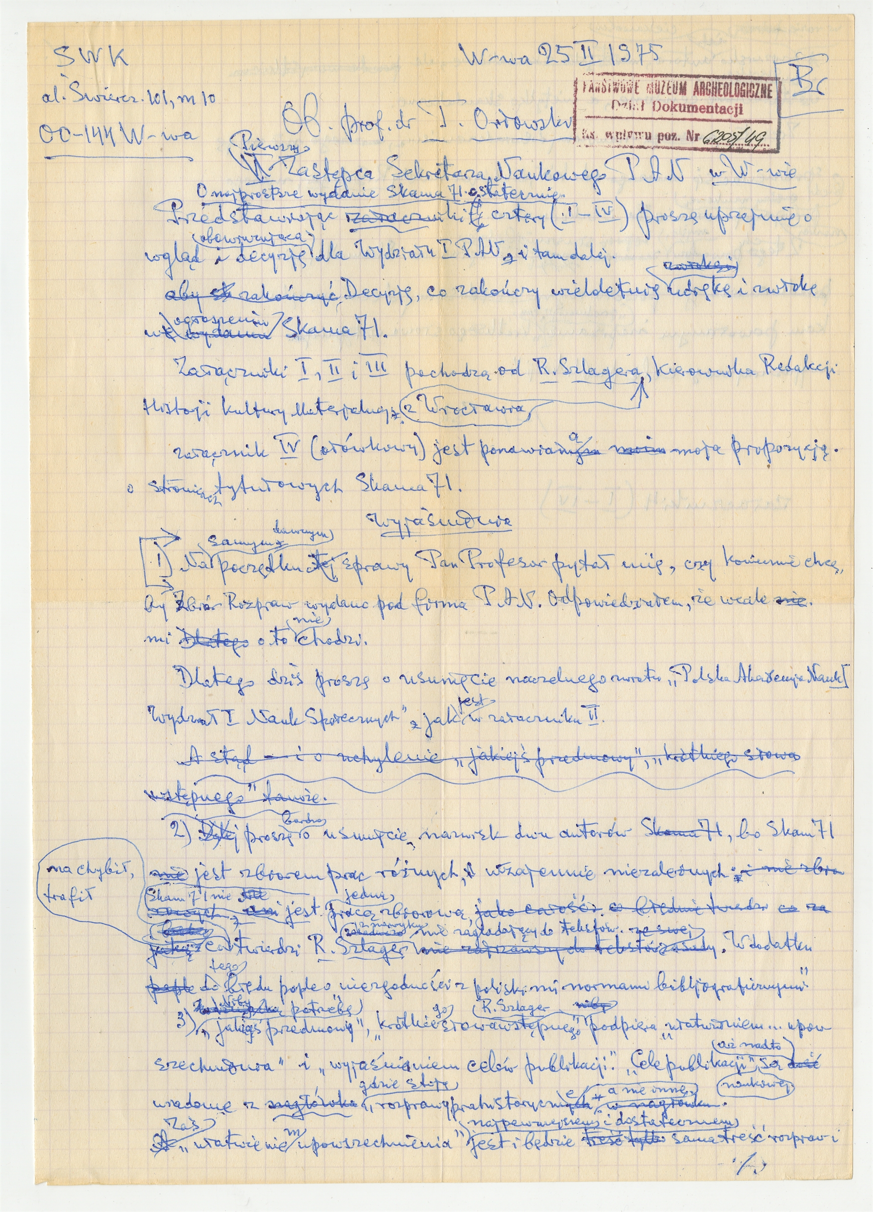 Rękopis - brudnopis listu Stefana Krukowskiego do T. Orłowskiego z dn. 25 II 1975 r.