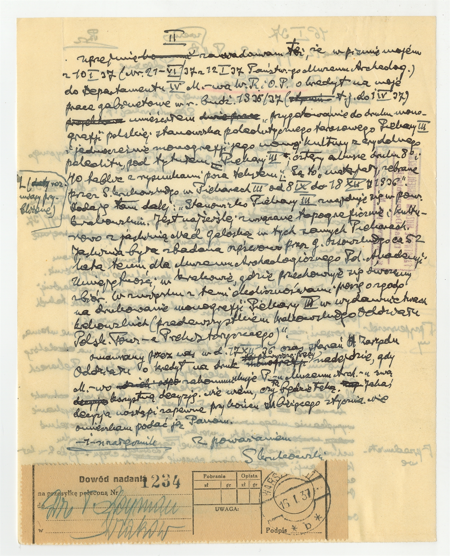 Rękopis - brudnopis listu Stefana Krukowskiego do T. Reymana z dn. 16 I 1937 r. z naklejonym dowodem nadania przesyłki poleconej z dn. 16 I [19]37 r.