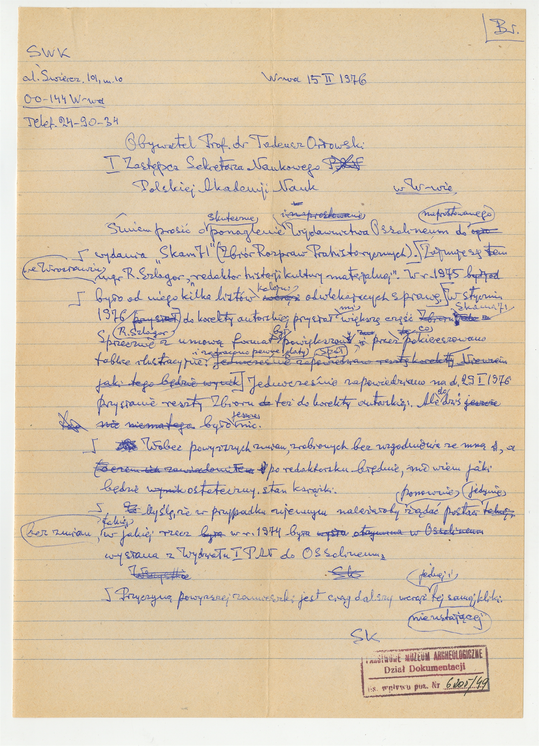 Rękopis - brudnopis listu Stefana Krukowskiego do Tadeusz Orłowskiego z dn. 15 II 1976 r.