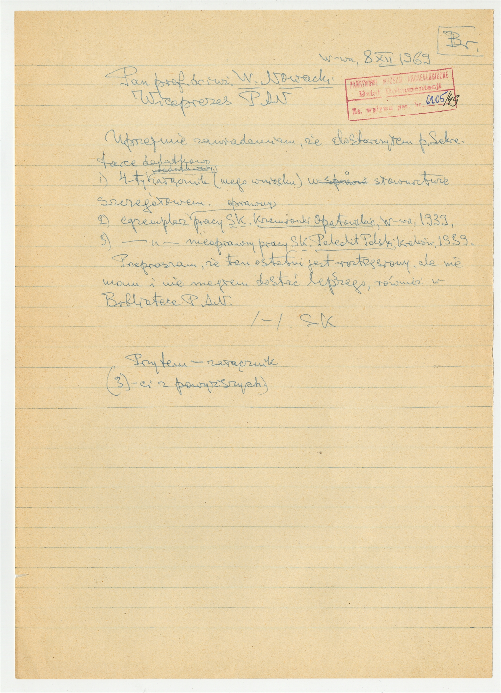 Rękopis - brudnopis listu Stefana Krukowskiego do W. Nowackiego z dn. 8 XII 1969 r.