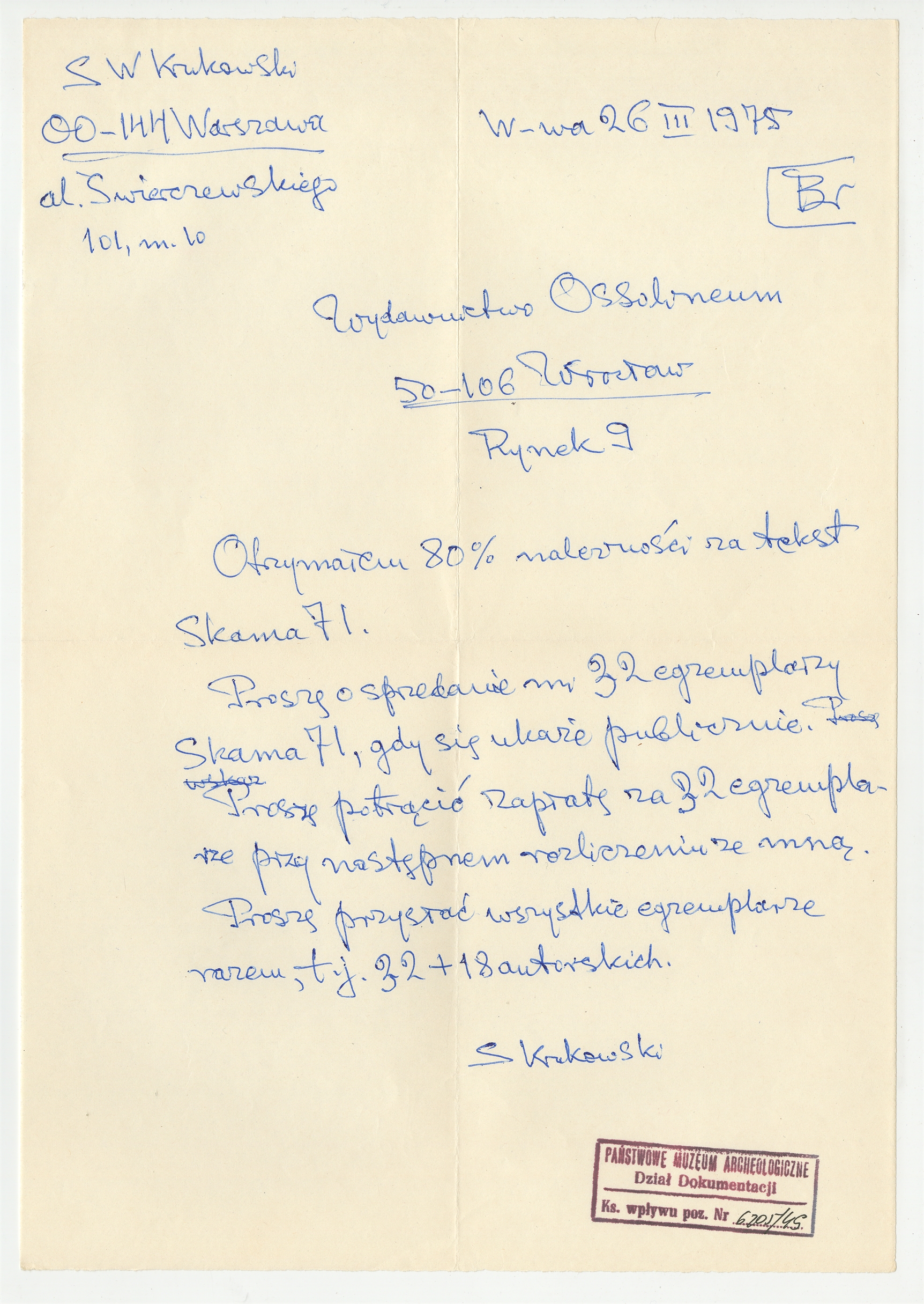 Rękopis - brudnopis listu Stefana Krukowskiego do Wydawnictwa Ossolineum z dn. 26 III 1975 r.