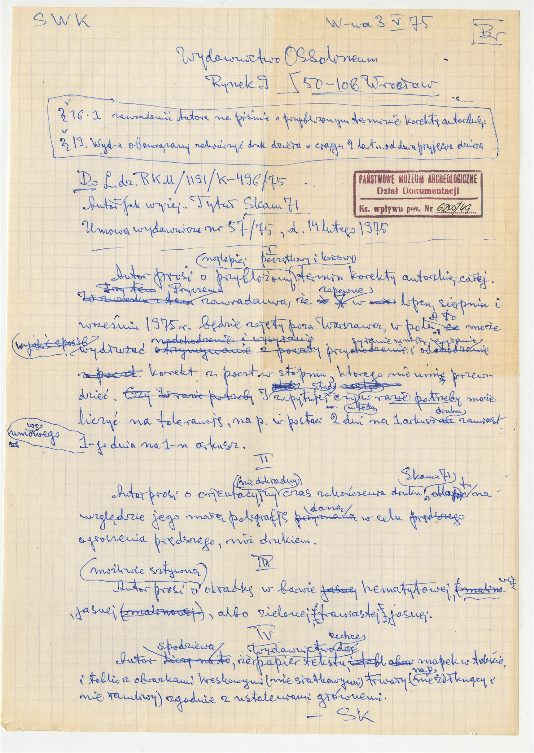 Rękopis - brudnopis listu Stefana Krukowskiego do Wydawnictwa Ossolineum z dn. 3 V 1975 r.