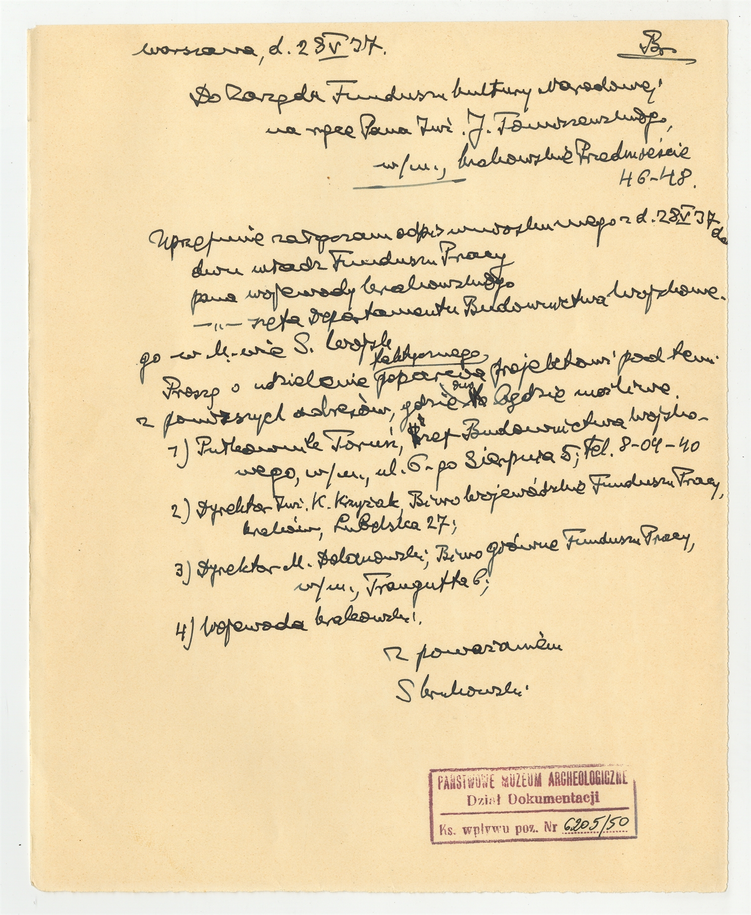 Rękopis - brudnopis listu Stefana Krukowskiego do Zarządu Funduszu Kultury Narodowej przy Prezydium Rady Ministrów z dn. 28 V 1937 r.