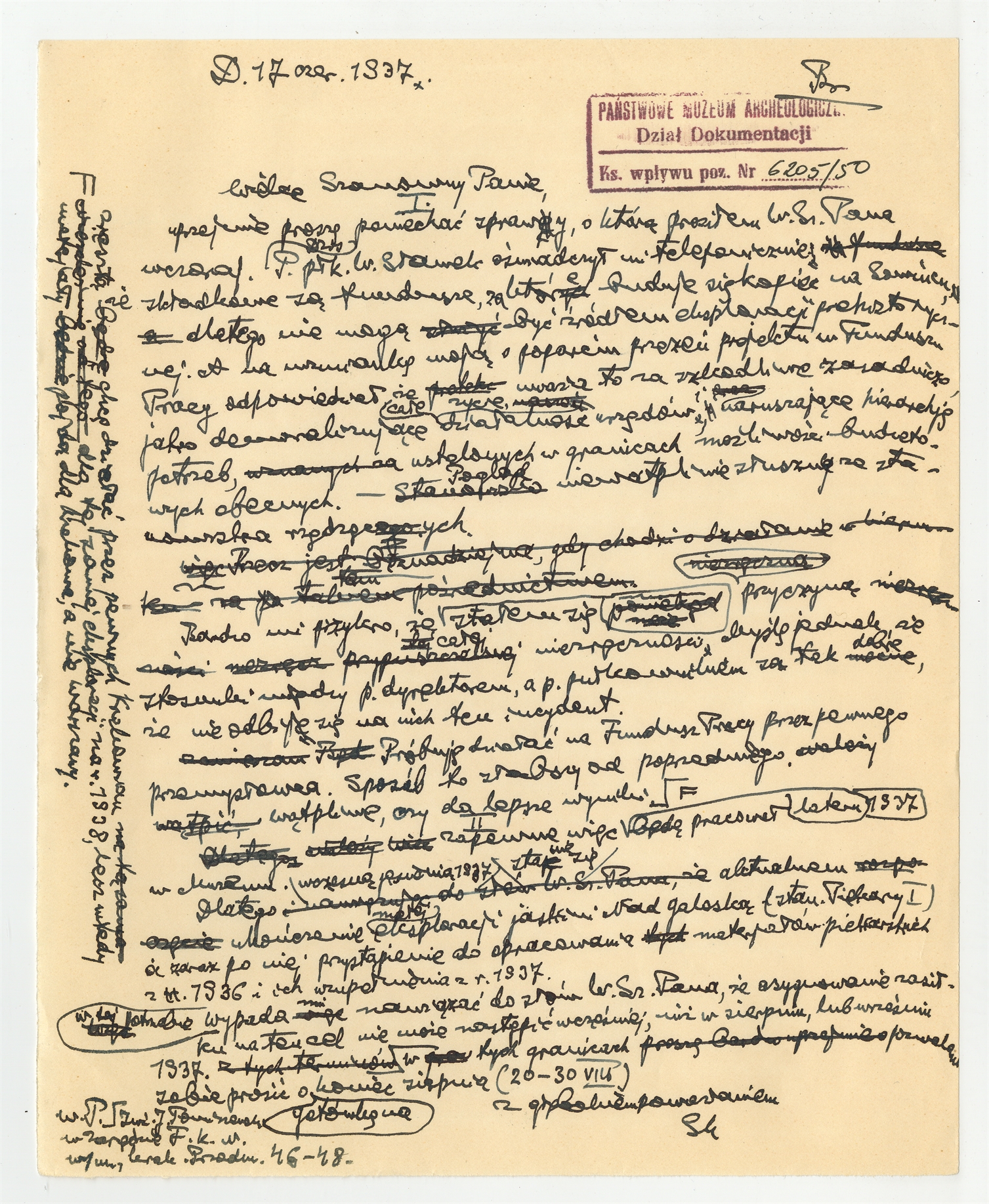 Rękopis - brudnopis listu Stefana Krukowskiego do Zarządu Funduszu Kultury Narodowej przy Prezydium Rady Ministrów z dnia 17 czerwca 1937 r.