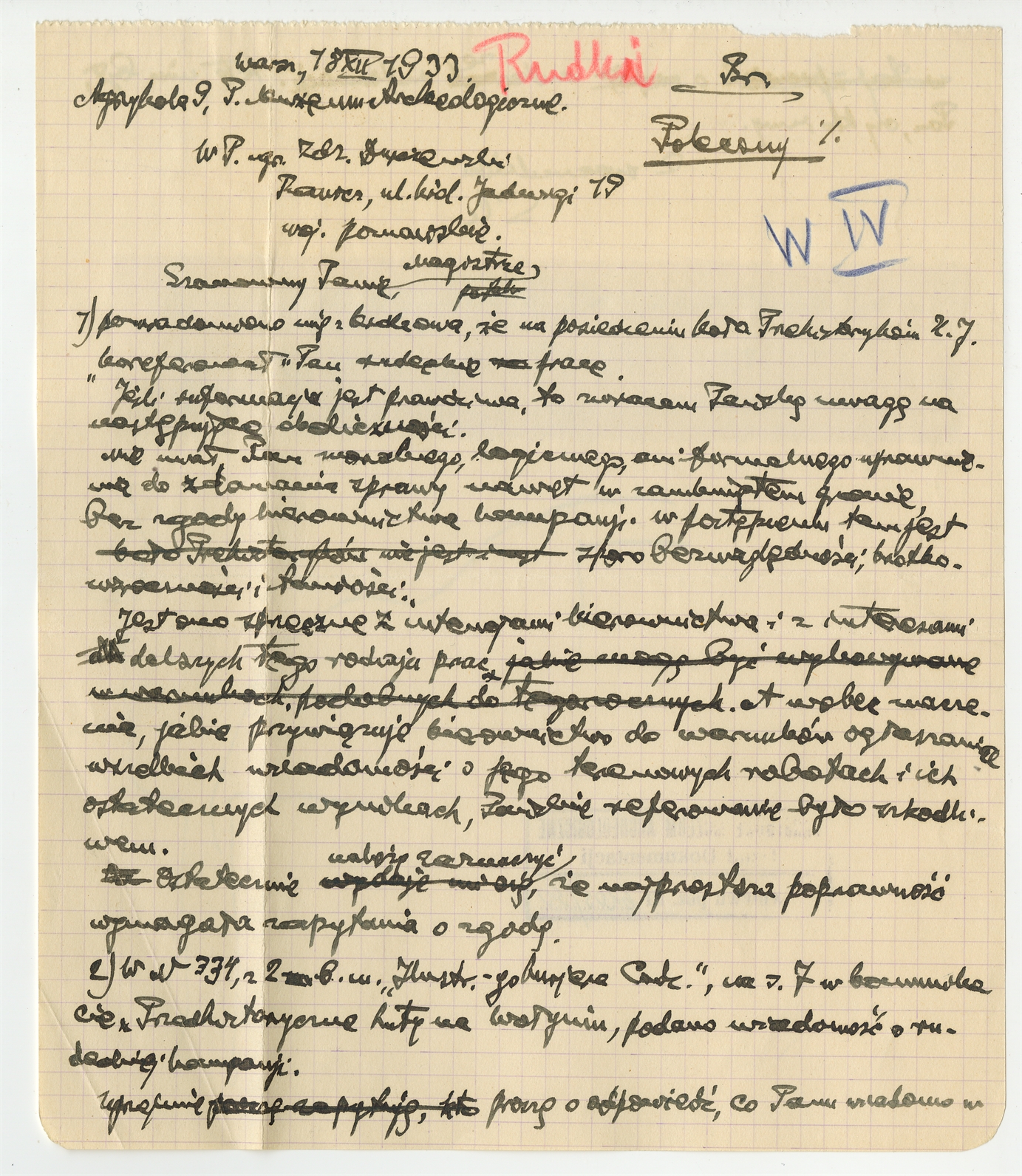 Rękopis - brudnopis listu Stefana Krukowskiego do Zdzisława Durczewskiego z dn. 18 XII 1933 r. z naklejonym dowodem nadania przesyłki poleconej z dn. 18 XII [19]33 r.