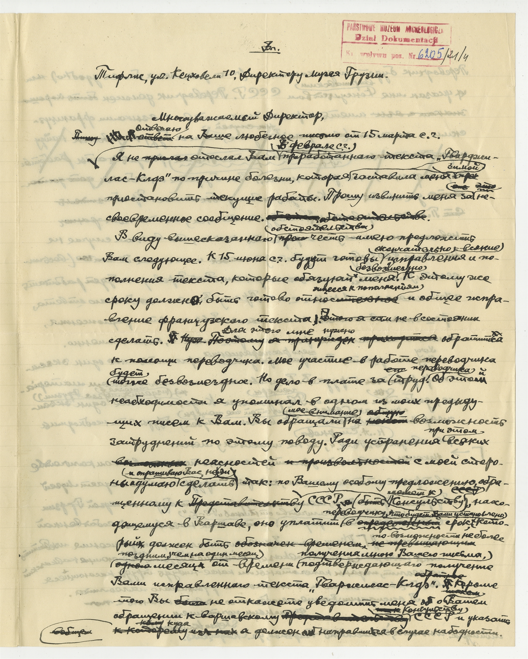 Rękopis - brudnopis listu Stefana Krukowskiego w języku rosyjskim do dyrektora Muzeum Gruzji