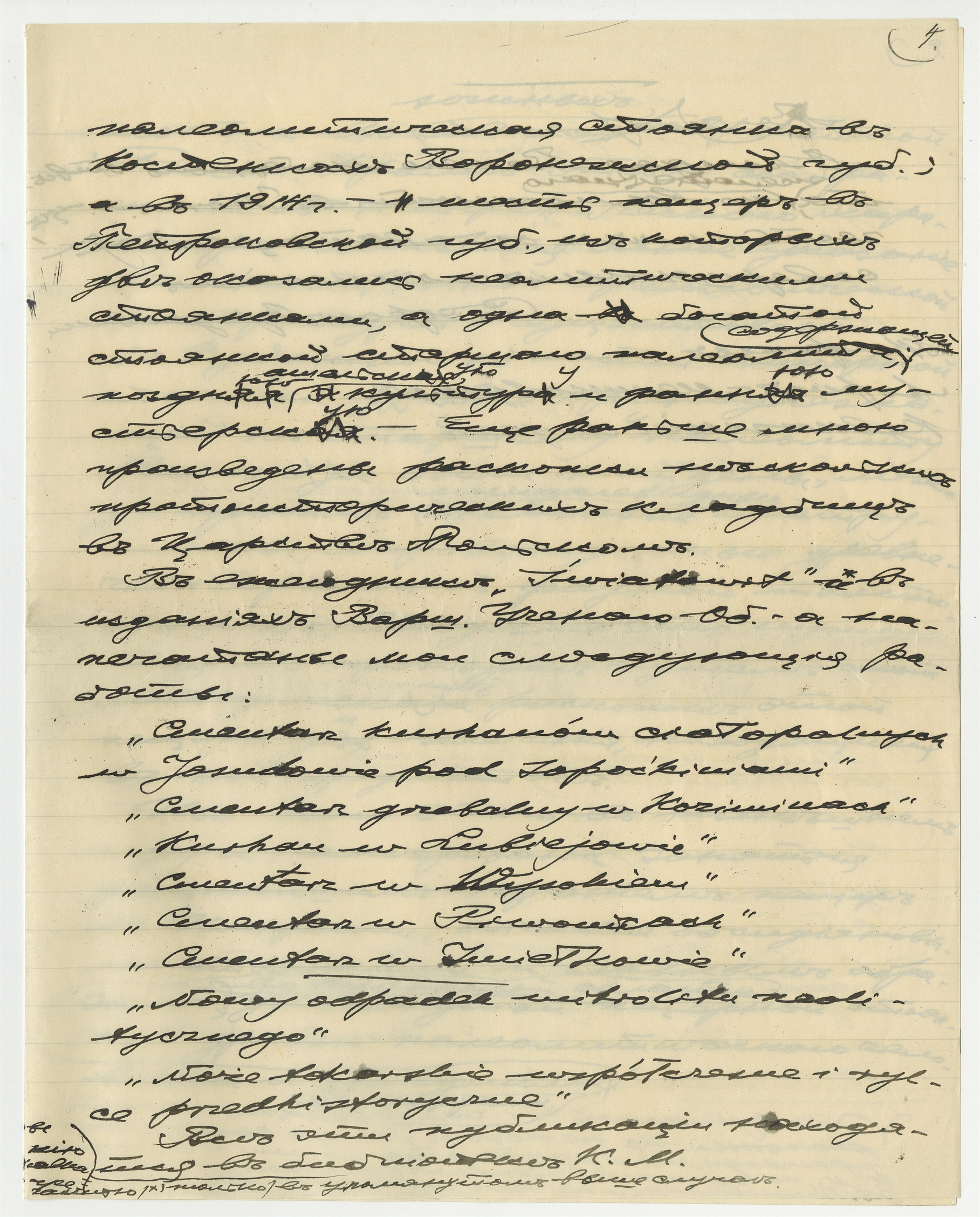 Rękopis - brudnopis listu (?) Stefana Krukowskiego w języku rosyjskim do Muzeum Kaukaskim dotyczącego doświadczenia badawczego i planów naukowych (strona 4)