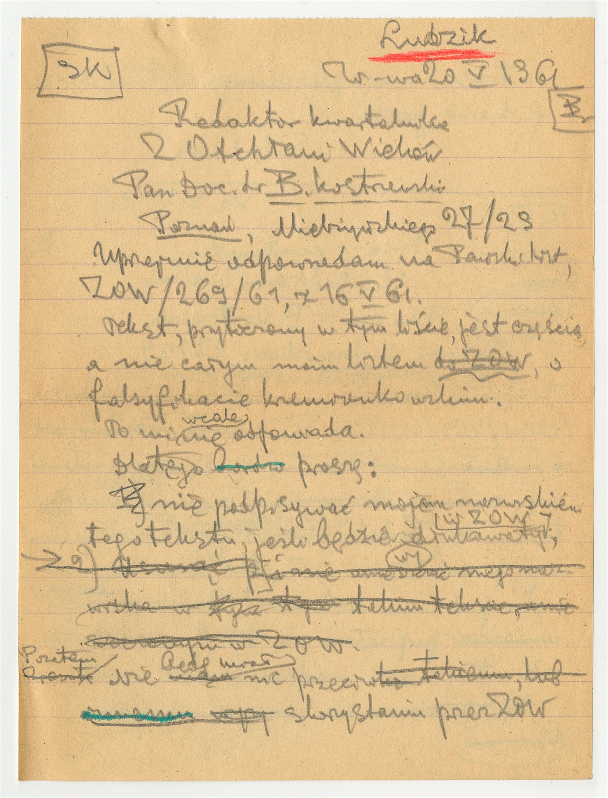 Rękopis - brudnopis listu Stefana Krukowskiego z 20 V 1961 roku do redaktora kwartalnika "z Otchłani Wieków"