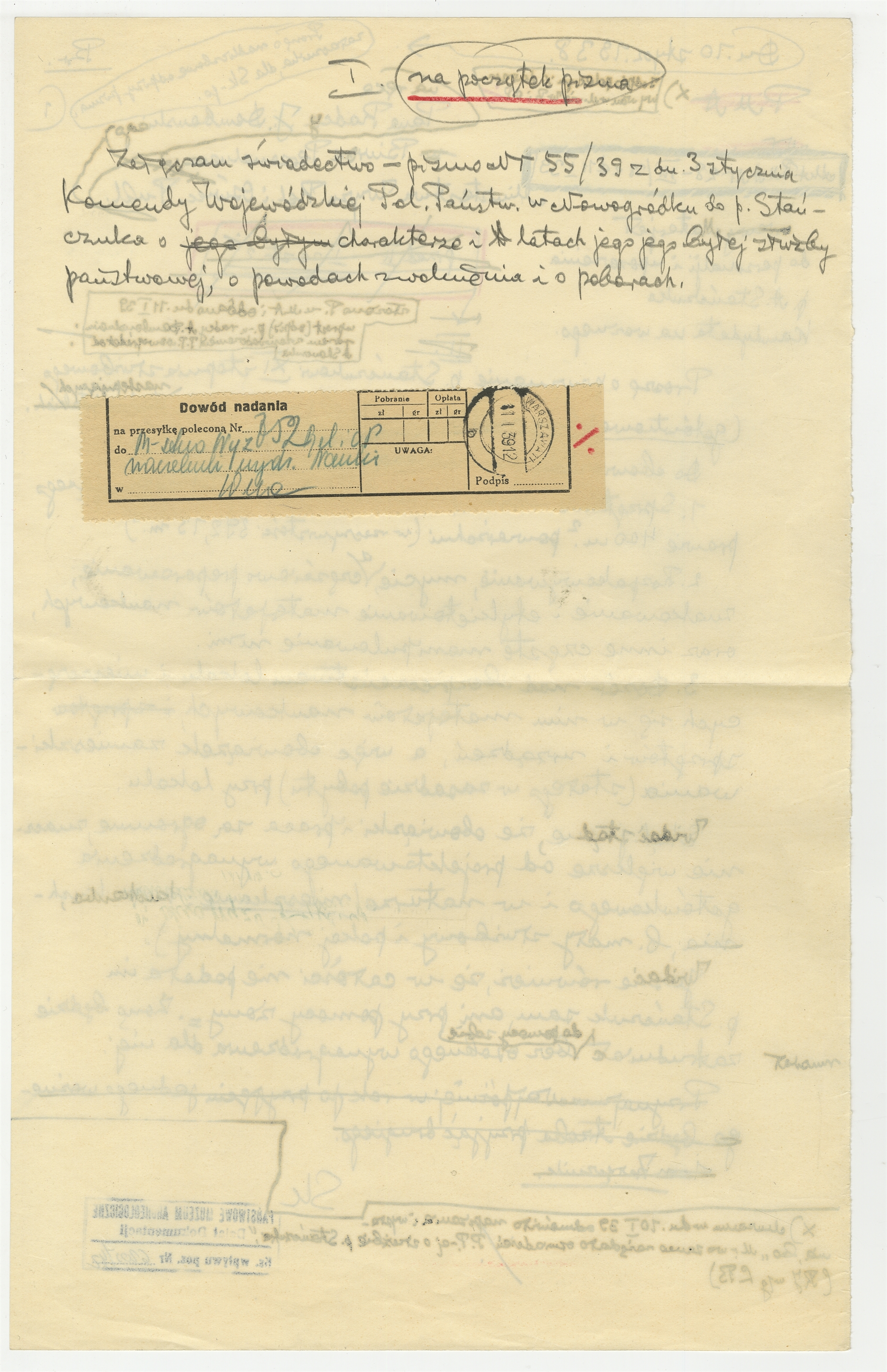 Rękopis - brudnopis listu Stefana Krukowskiego z dnia 10 stycznia 1938 roku do J. Dembowskiego w sprawie uposażenia A. Stańczuka (cd) wraz z dowodem nadania przesyłki poleconej
