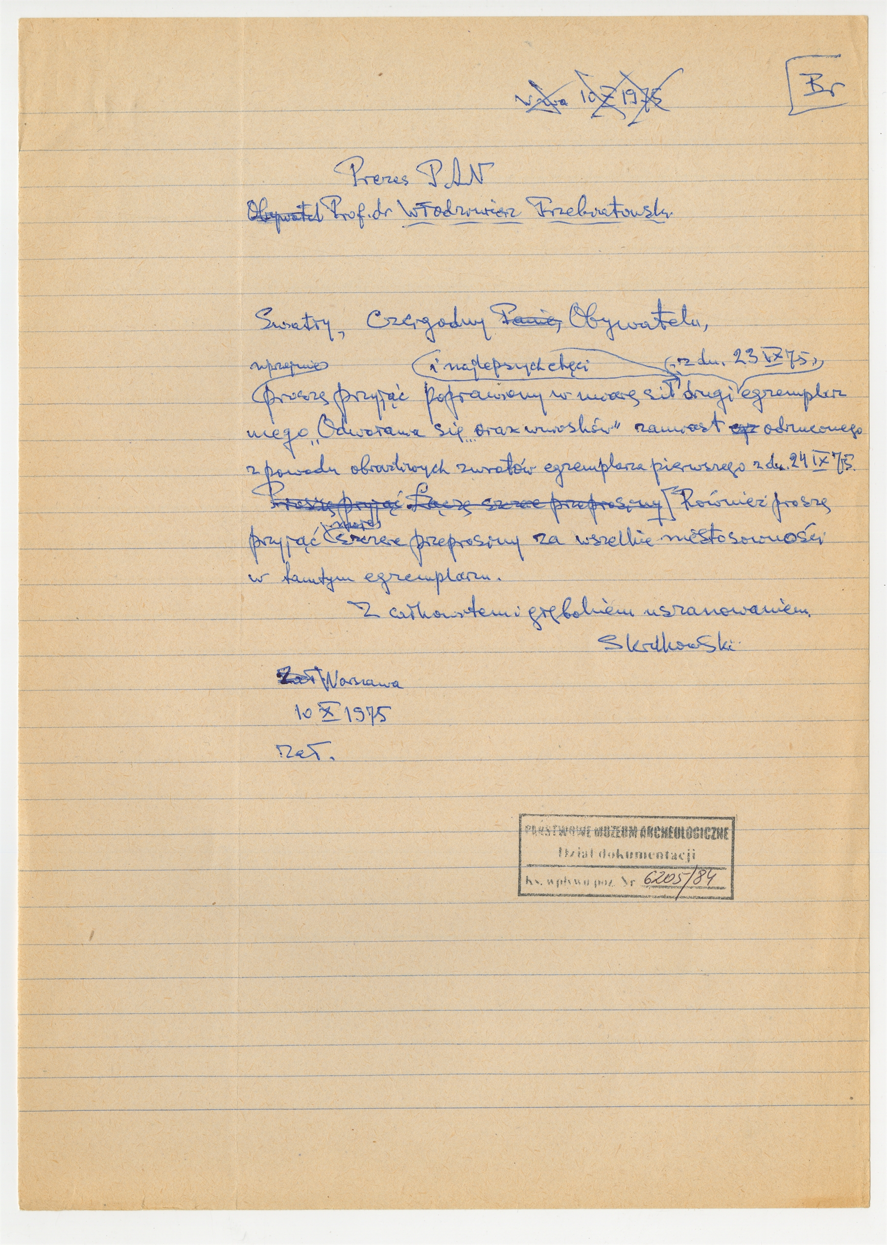Rękopis - brudnopis listu Stefana Krukowskiego z dnia 10 X 1975 roku do Włodzimierza Trzebiatowskiego Prezesa PAN