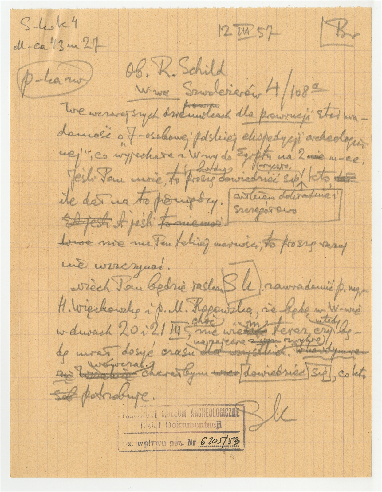 Rękopis - brudnopis listu Stefana Krukowskiego z dnia 12 III [19]57 roku do Romualda Schilda
