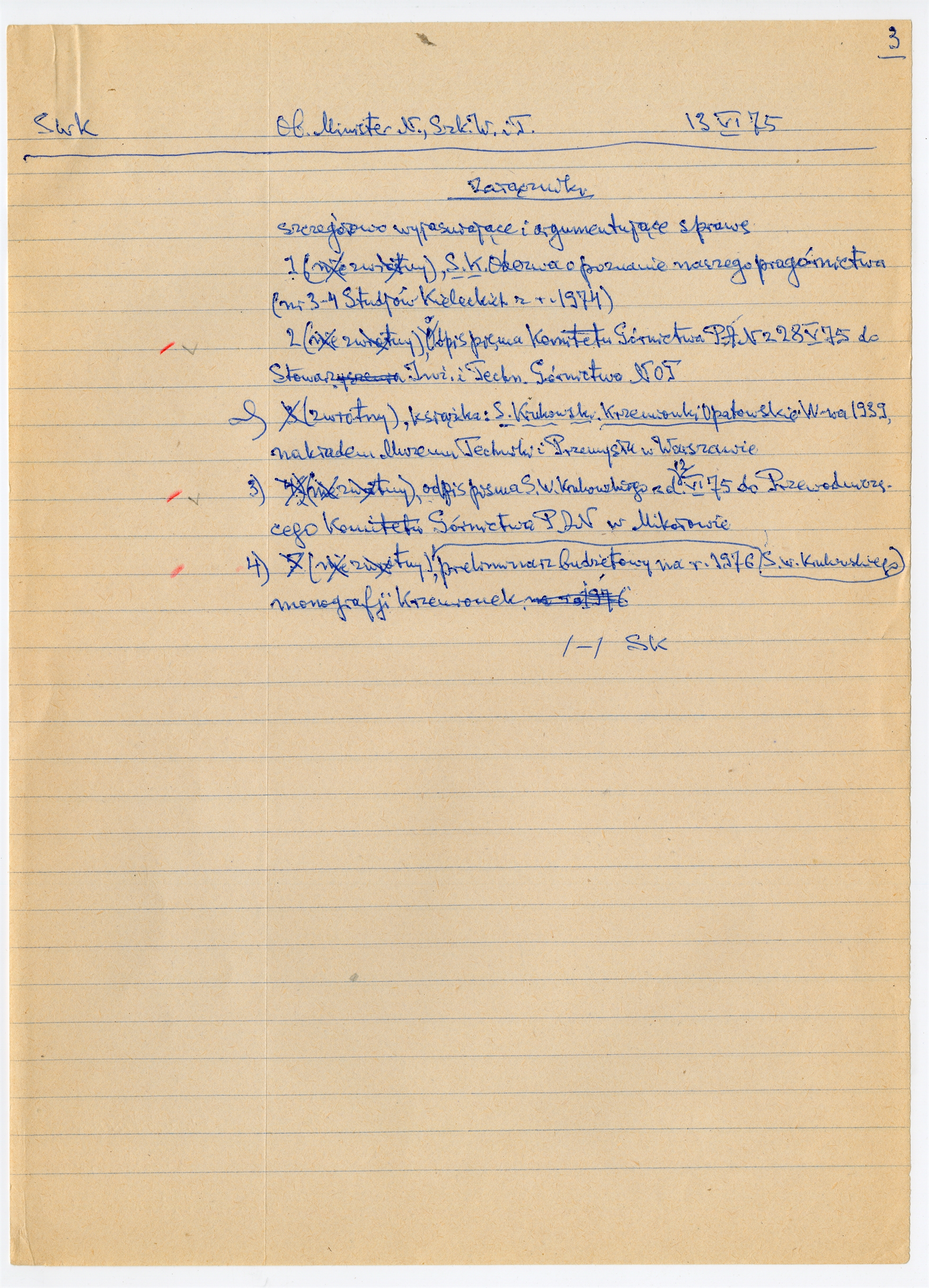 Rękopis - brudnopis listu Stefana Krukowskiego z dnia 13 czerwca 1975 roku do Sylwestra Kaliskiego Ministra Nauki Szkół Wyższych i Techniki wykaz załączników - strona 3