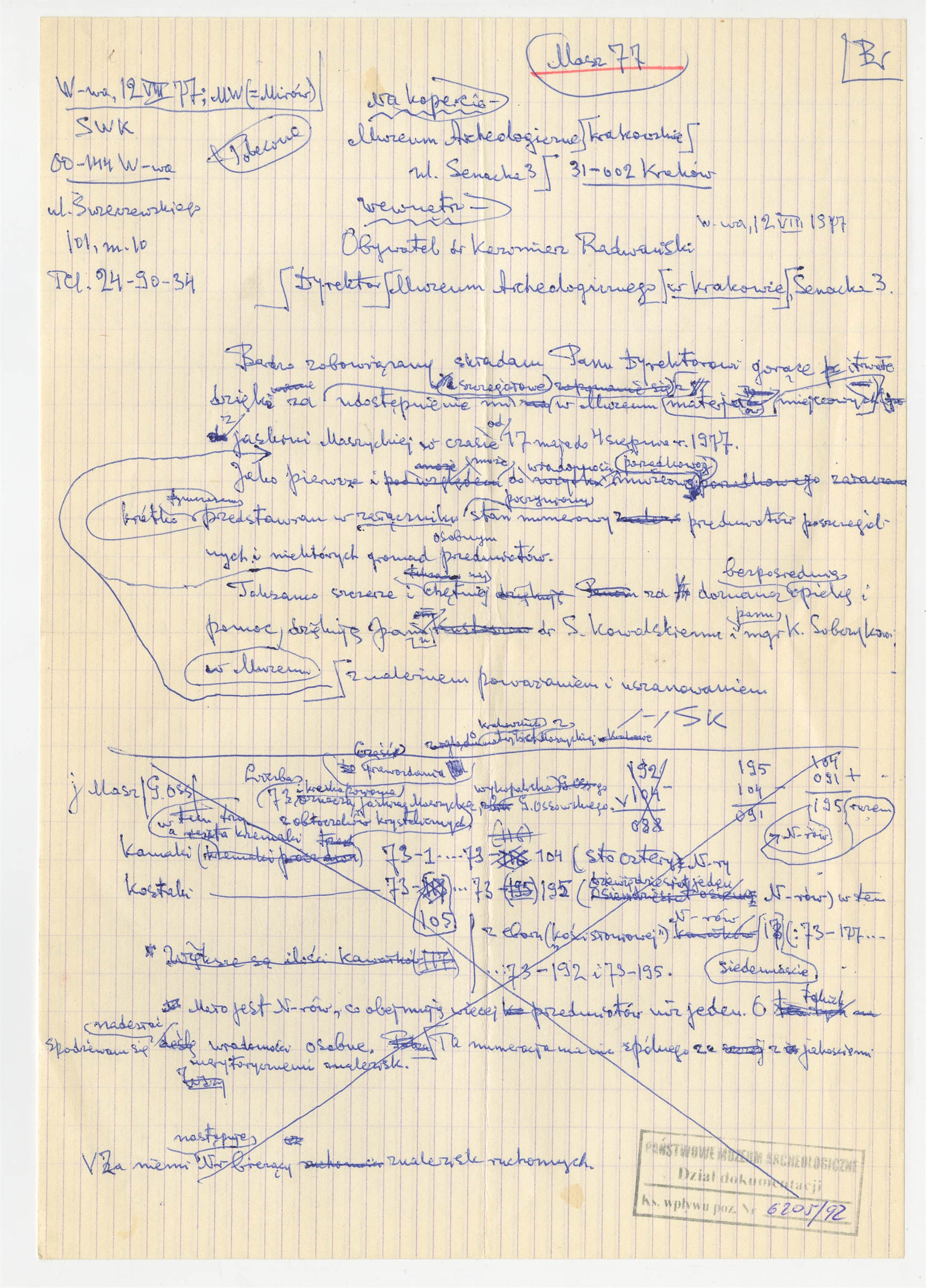 Rękopis - brudnopis listu Stefana Krukowskiego z dnia 13 VIII 1977 roku do Kazimierza Radwańskiego  dyrektora Muzeum Archeologicznego w Krakowie