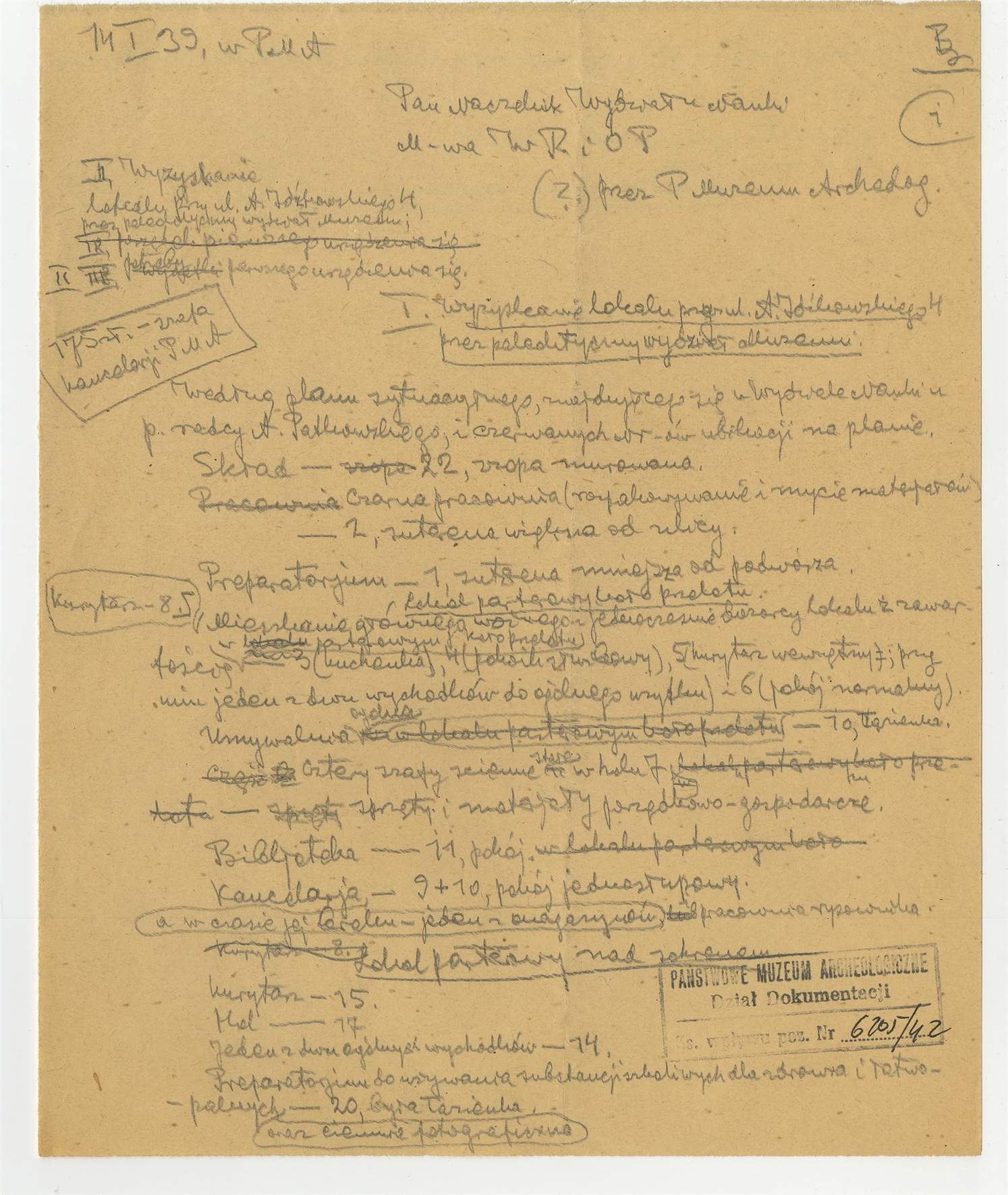 Rękopis - brudnopis listu Stefana Krukowskiego z dnia 14 I [19]39 roku do Naczelnika Wydziału Nauki Ministerstwa W.R. i O.P. w sprawie lokalu przy ul. A. Idźkowskiego 4