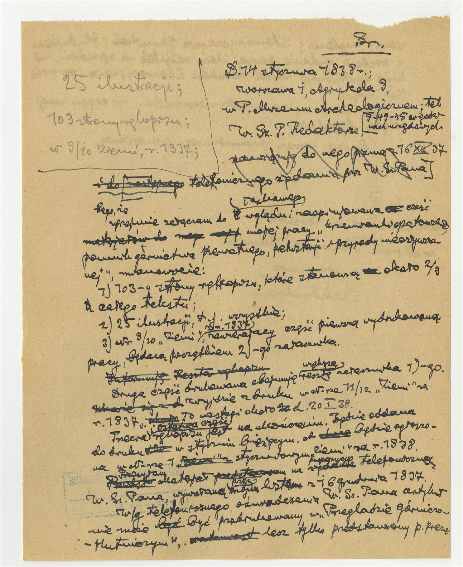 Rękopis - brudnopis listu Stefana Krukowskiego z dnia 14 stycznia 1938 roku do S. Kossutha