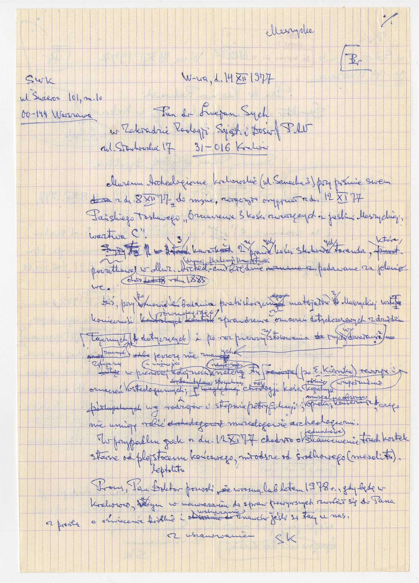 Rękopis - brudnopis listu Stefana Krukowskiego z dnia 14 XII 1977 roku do Lucjana Sycha