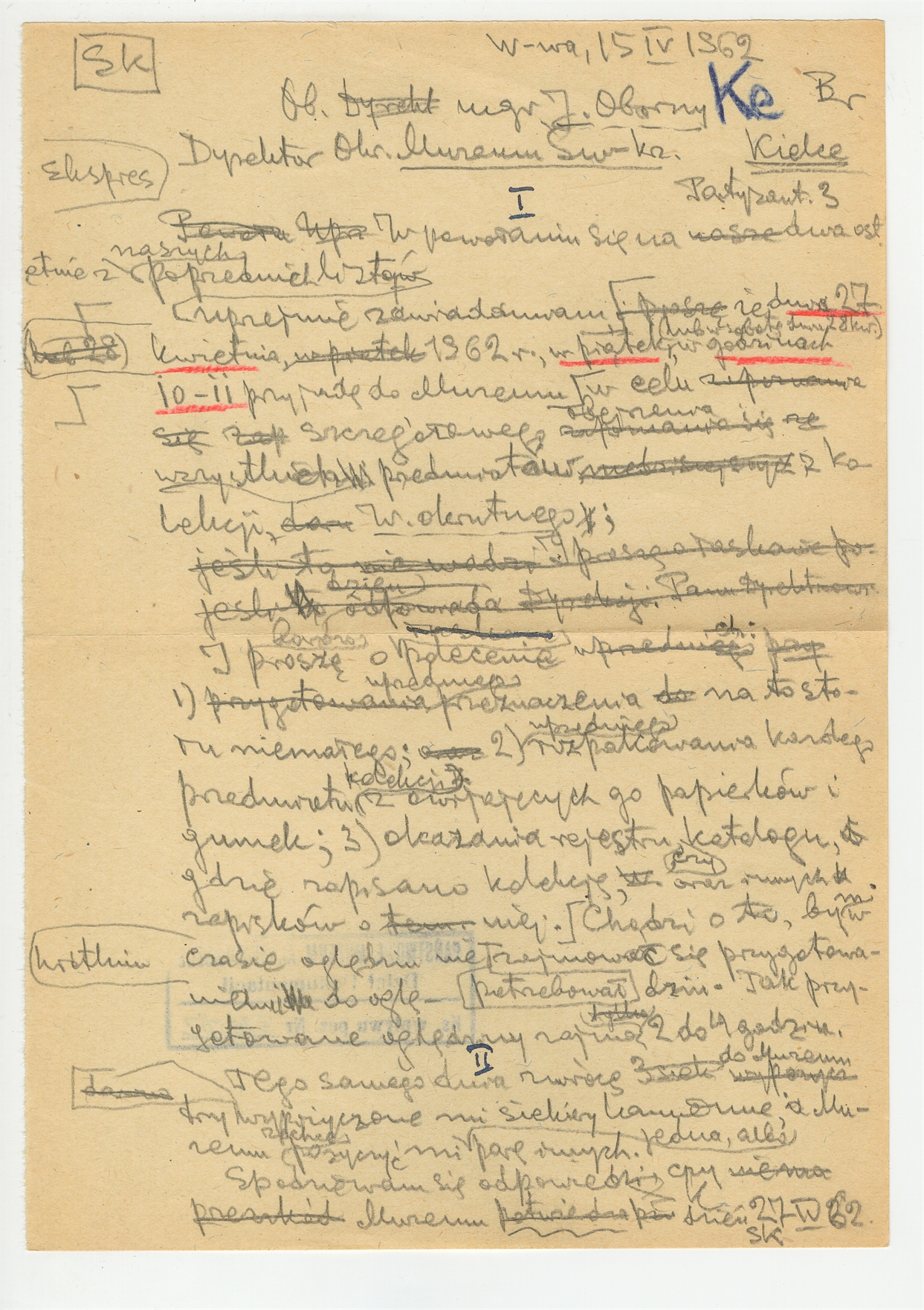 Rękopis - brudnopis listu Stefana Krukowskiego z dnia 15 IV 1962 roku do A. Obornego
