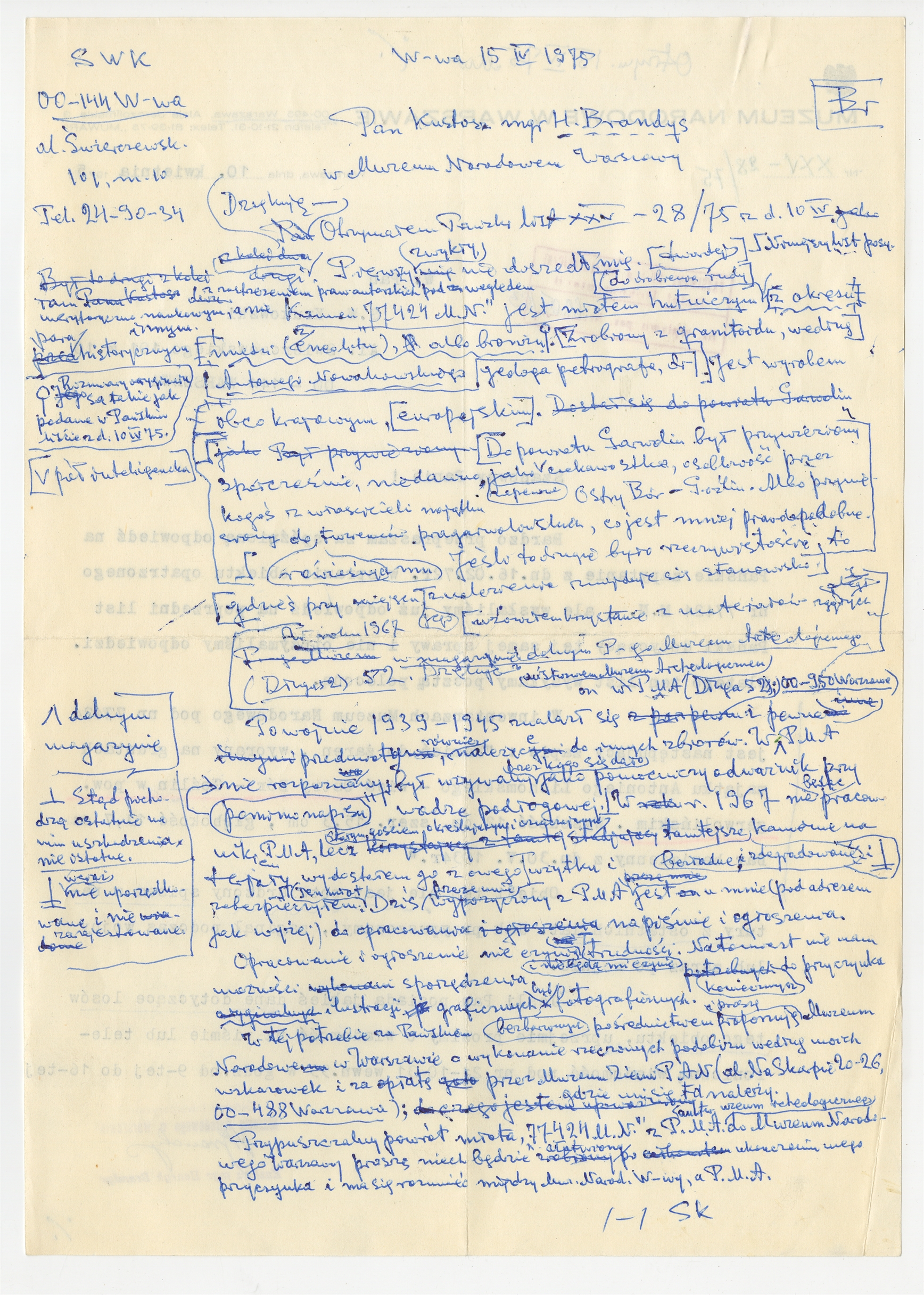 Rękopis - brudnopis listu Stefana Krukowskiego z dnia 15 IV 1975 roku do Henryka Brandysa kustosza Muzeum Narodowego w Warszawie