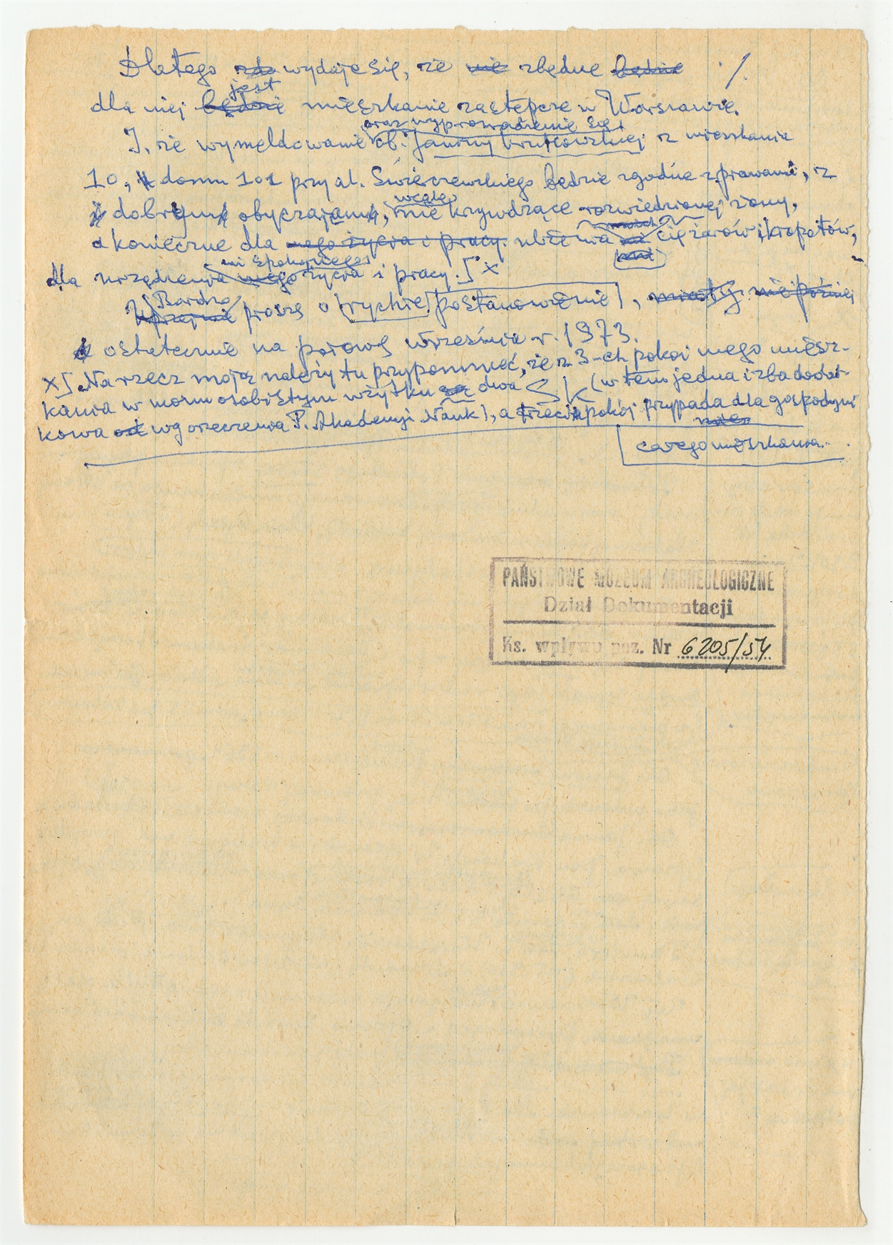 Rękopis - brudnopis listu Stefana Krukowskiego z dnia 15 lipca 1973 roku do Prezydium Rady Narodowej w Warszawie w sprawie wymeldowania Janiny Krukowskiej