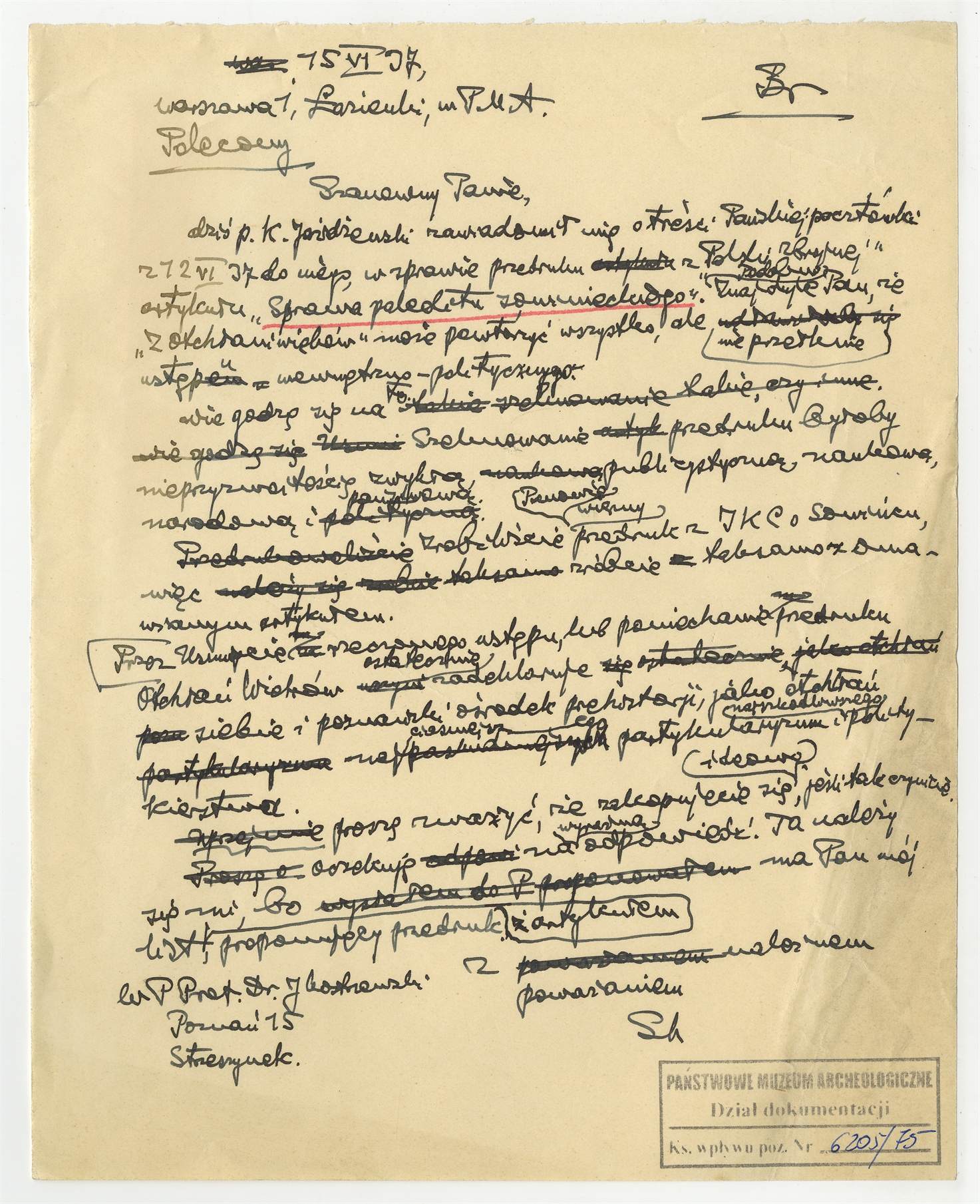 Rękopis - brudnopis listu Stefana Krukowskiego z dnia 15 VI[19]37 roku do prof. J. Kostrzewskiego