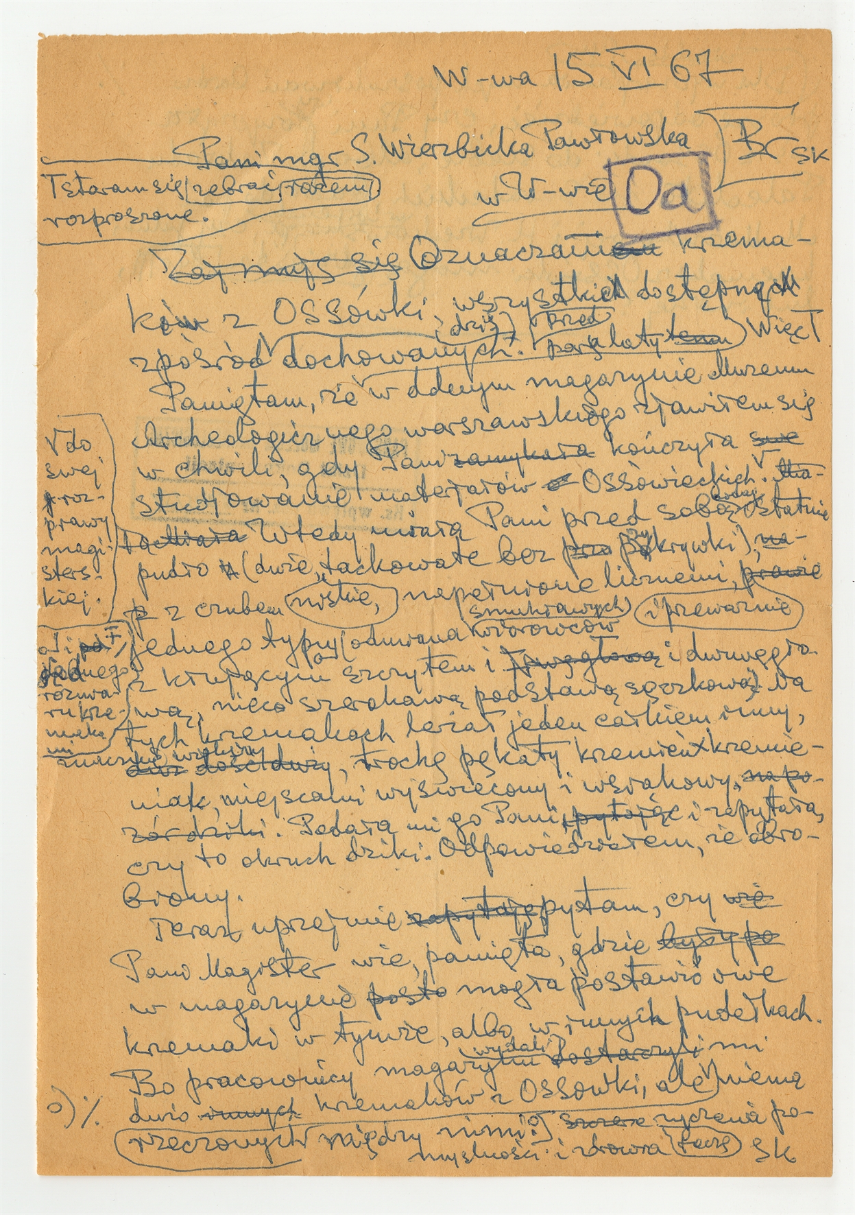 Rękopis - brudnopis listu Stefana Krukowskiego z dnia 15 VI [19]67 roku do Sylwii Wierzbickiej - Pawłowskiej