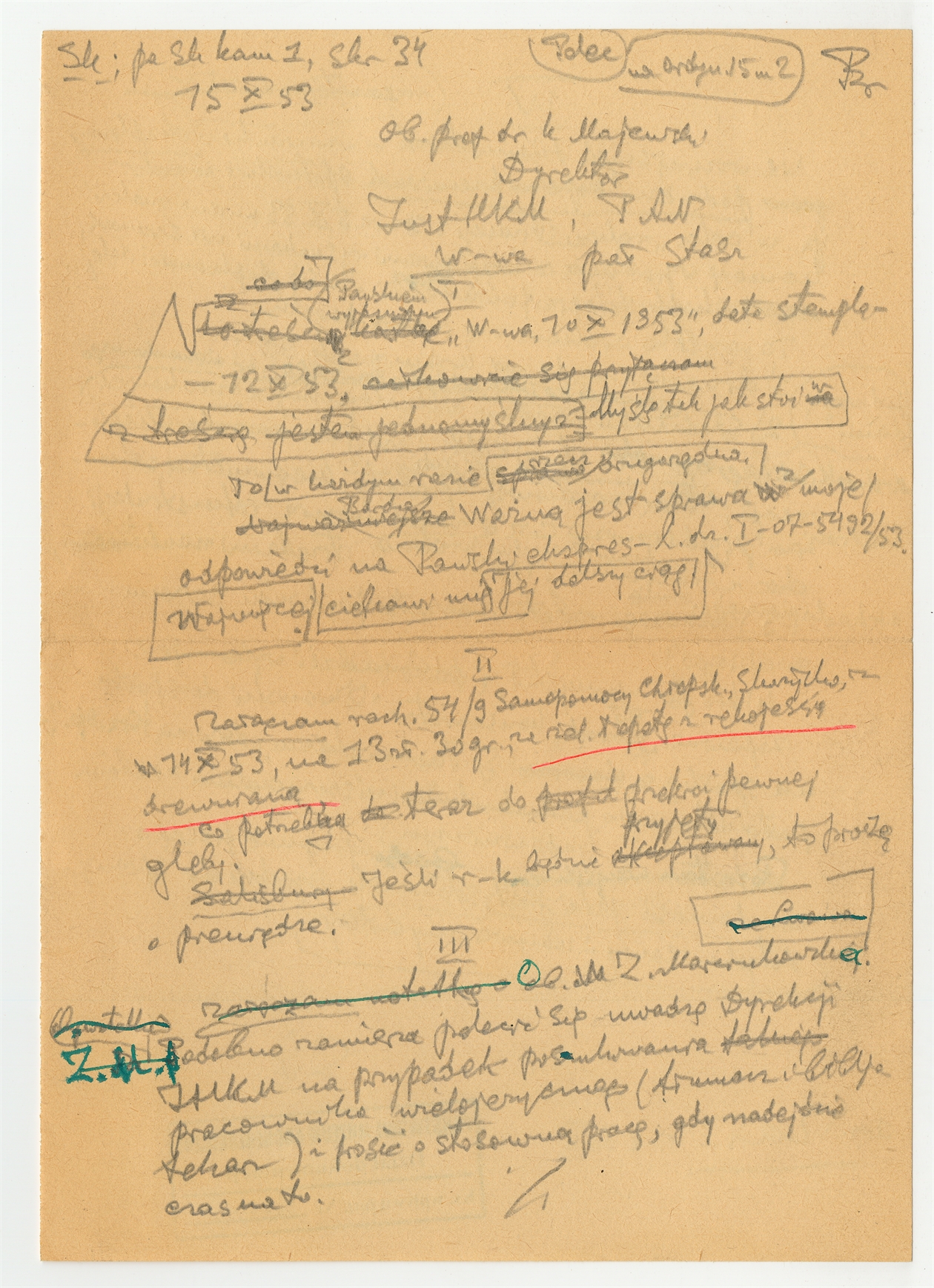 Rękopis - brudnopis listu Stefana Krukowskiego z dnia 15 X [19]53 roku do K. Majewskiego dyrektora IHKM PAN