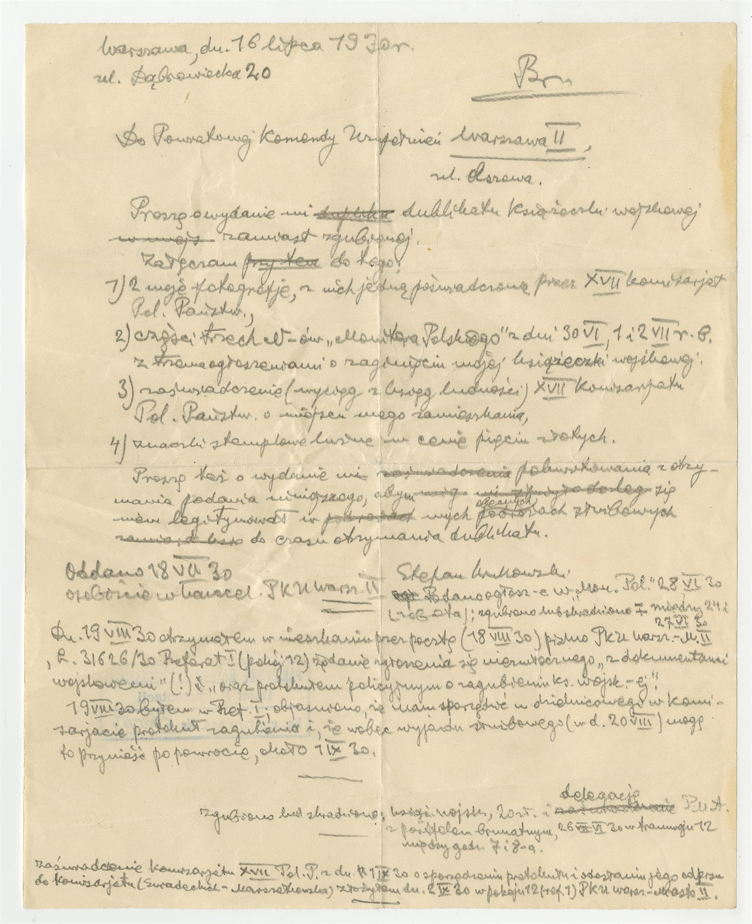 Rękopis - brudnopis listu Stefana Krukowskiego z dnia 16 lipca 1930 roku do Powiatowej Komendy Uzupełnień Warszawa II wraz z notatką dotyczącą listu