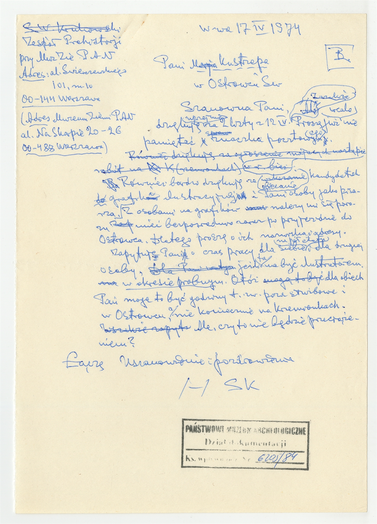 Rękopis - brudnopis listu Stefana Krukowskiego z dnia 17 IV 1974 roku do Melanii Kustrzepy