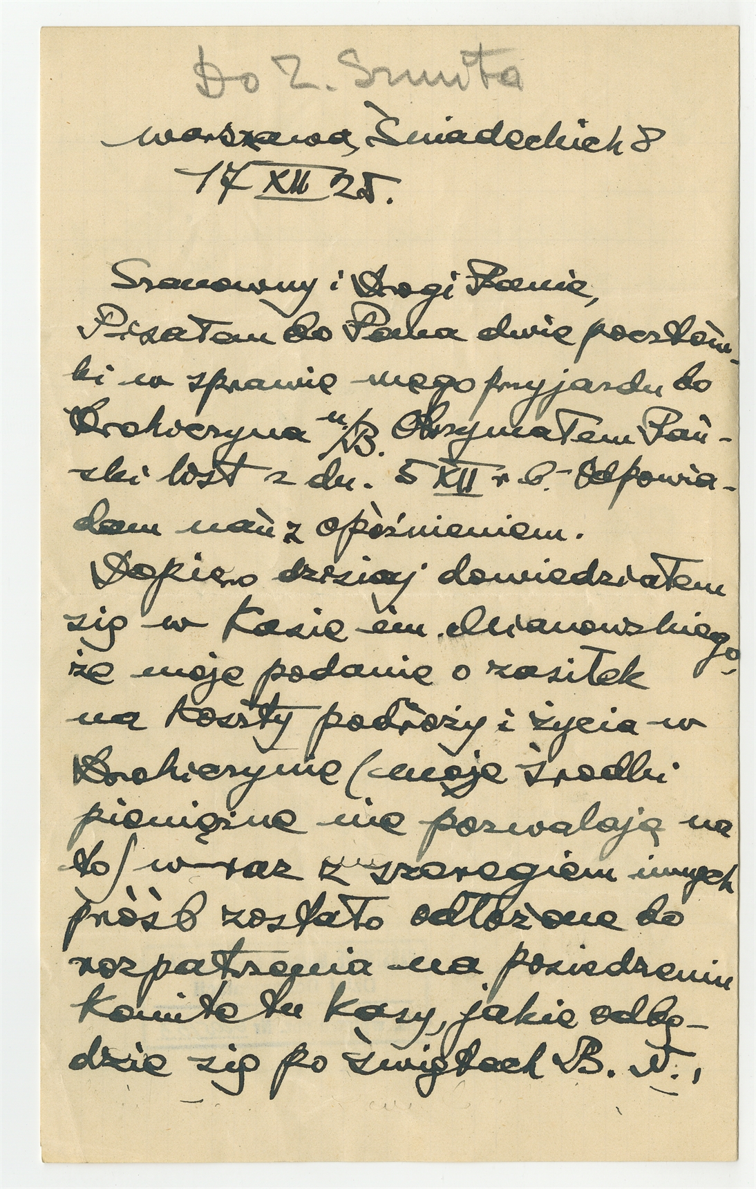 Rękopis - brudnopis listu Stefana Krukowskiego z dnia 17 XII [19]25 roku do Zygmunta Szmita