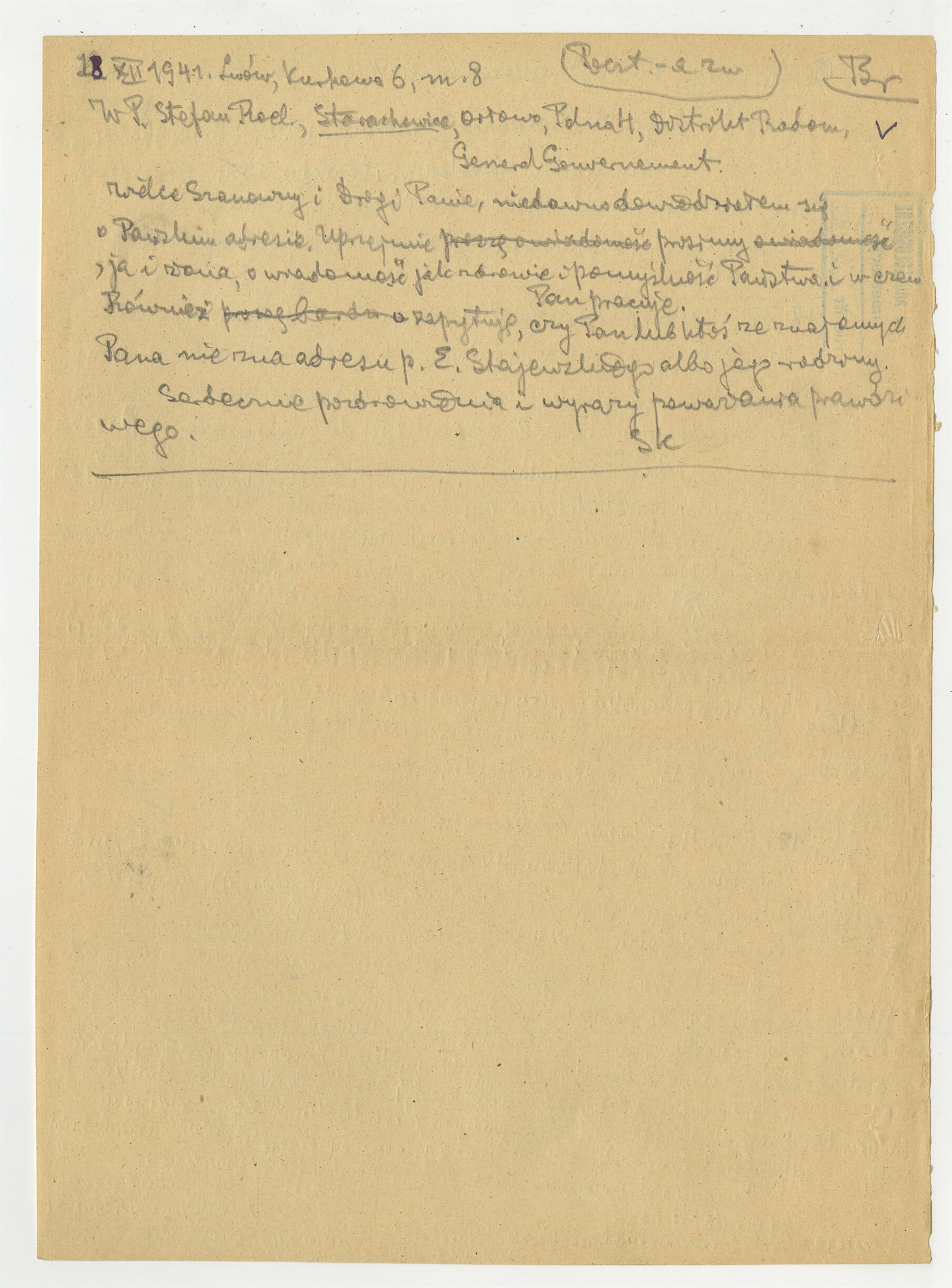Rękopis - brudnopis listu Stefana Krukowskiego z dnia 18 XII 1941 roku do Stefana Roela