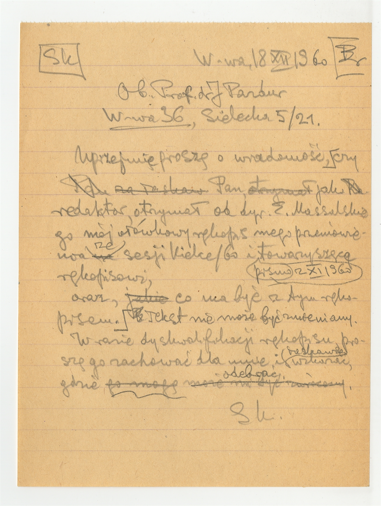 Rękopis - brudnopis listu Stefana Krukowskiego z dnia 18 XII 1960 roku do Jana Pazdura